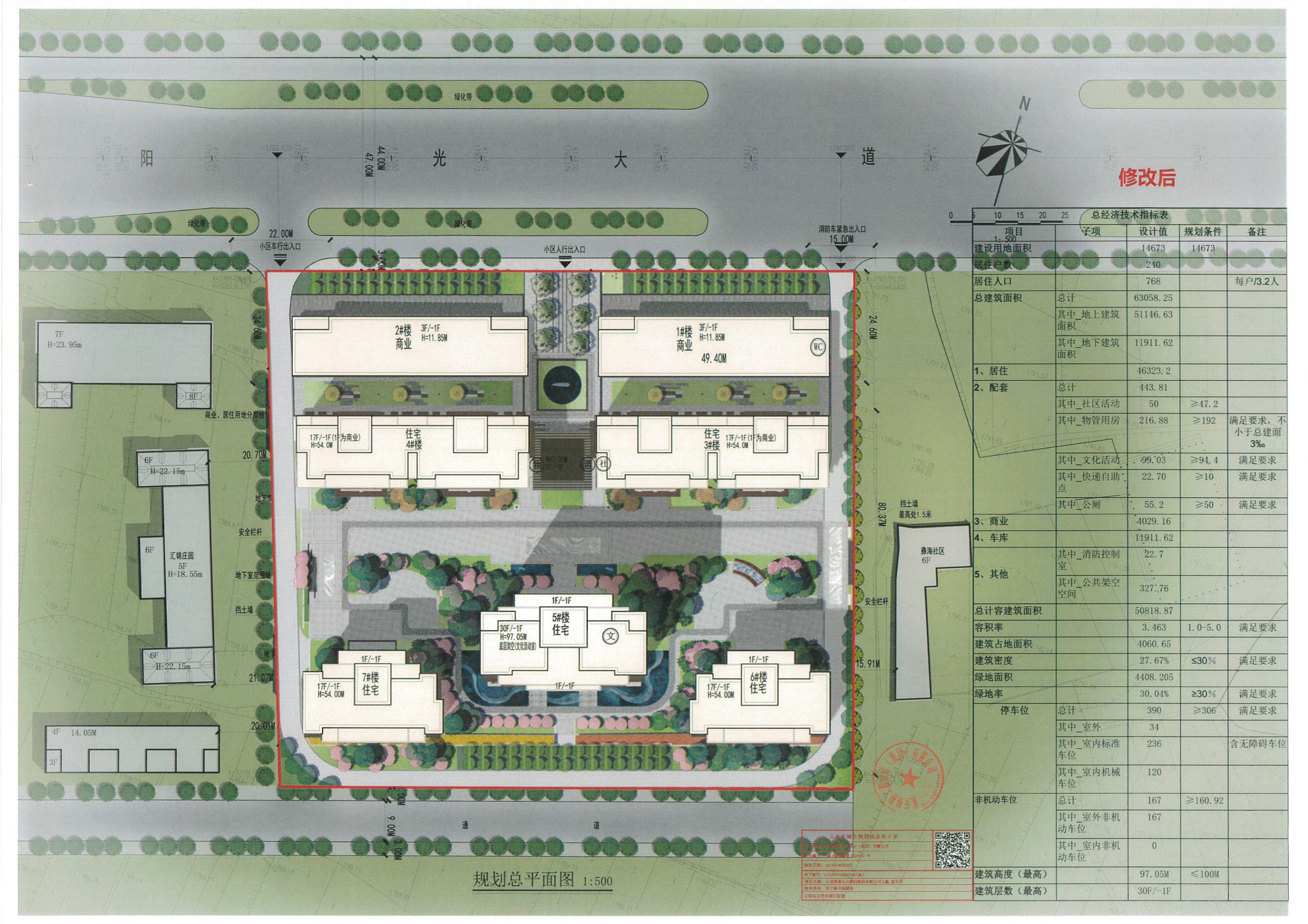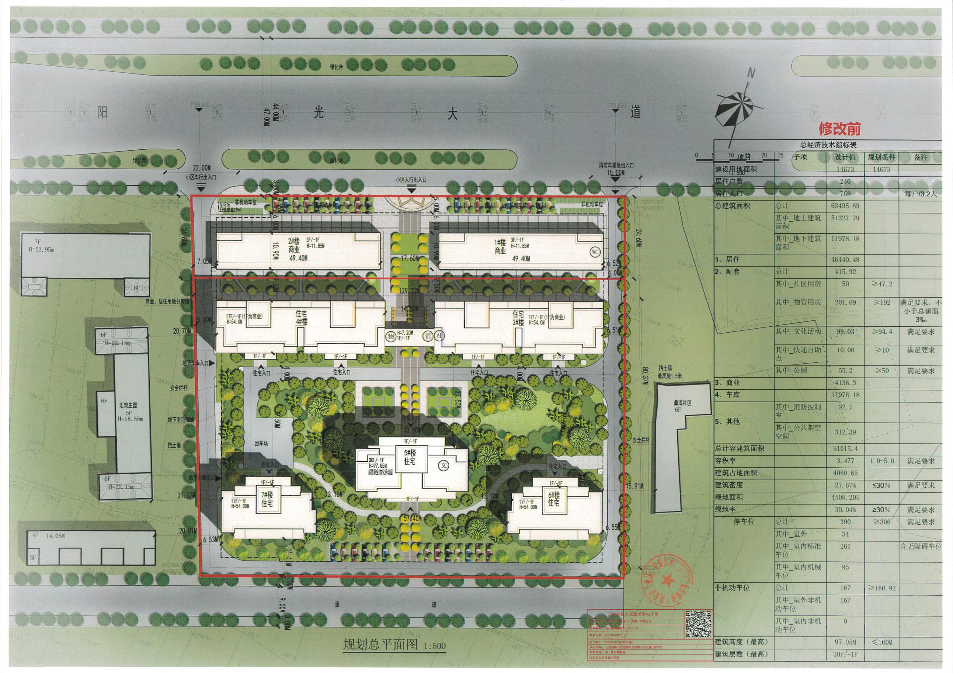 4、修建性规划审定总建筑面积为63495.89㎡,根据施工图设计,及该项目核发的《建设工程规划许可证》规划许可总建筑面积为63058.25㎡,减少437.64㎡,现予以调整。
