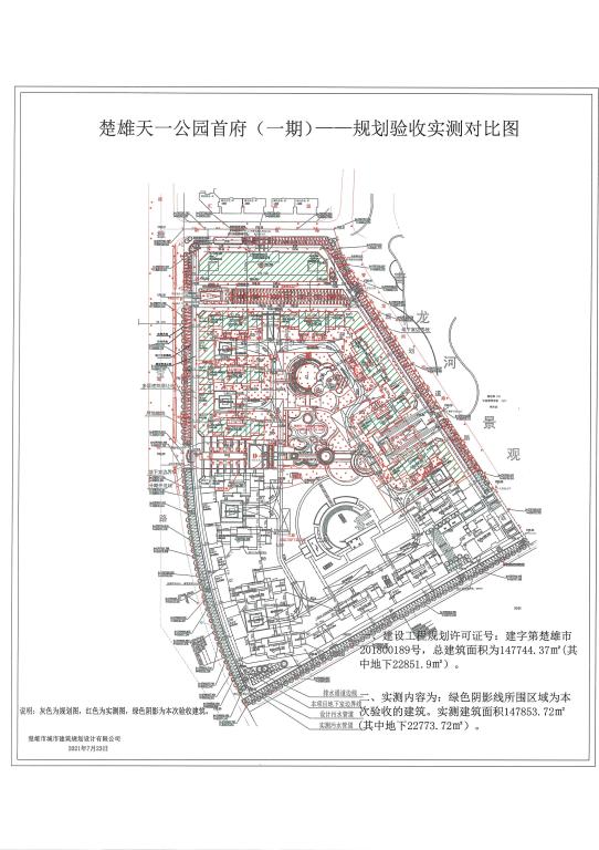 项目简介:楚雄三桥房地产开发有限公司开发建设的楚雄天一公园首府建设项目位于楚雄市东南新城雄宝路(原226线)以东,规划总用地面积67997.84㎡(合102亩),其修建性详细规划于2018年10月8日审定,分两期实施建设。楚雄天一公园首府建设项目(一期)规划用地面积35735.23㎡,总建筑面积147630.13㎡,计容建筑面积124625.7㎡,不计容建筑面积23004.43㎡,容积率3.49,建筑密度25.85%,绿地率28.05%,机动车停车位701个(地上停车位203个,地下停车位498个)。2018年10月项目建设单位根据审定的项目修建性详细规划,办理了楚雄天一公园首府建设项目(一期)《建设工程规划许可证》(编号为建字第楚雄市201800189号),许可总建筑面积147744.37㎡,其中地上面积124892.47㎡,地下面积22851.9㎡,其许可内容为:商业用房一栋地上5层;高层底商住宅七栋地上32层;低层商业两栋地上2层;低层商业一栋地上1层;地下室一座1层。2021年6月楚雄三桥房地产开发有限公司向我局申请对已竣工的楚雄天一公园首府建设项目(一期)建设内容进行规划核实验收,经测绘单位实测和现场比对,楚雄天一公园首府建设项目(一期)项目实测用地面积35735.23㎡,总建筑面积147853.72㎡,实测建筑面积超出规划许可109.35㎡,面积超出部分主要是由于7#及8#一层增设商业走廊提供公共使用,并且该商业走廊面积不计入容积率,实测计容建筑面积124621.77㎡,不计容建筑面积23231.95㎡,建筑密度26.31%,但其相对于规划的误差值小于0.5%,容积率3.49,绿地率27.26%,实测绿地面积低于修规绿地面积281㎡,面积减少部分主要是由于建设单位将5#西侧约390㎡原景观绿地改建为儿童休闲娱乐活动场地,此外实测机动车停车位共705个(地上停车位211个,地下停车位494个)。根据《楚雄州建设工程竣工规划验收管理办法》的规定特进行公示,如对楚雄天一公园首府建设项目(一期)建设内容规划核实验收有异议的请在公示期限内与我局联系。