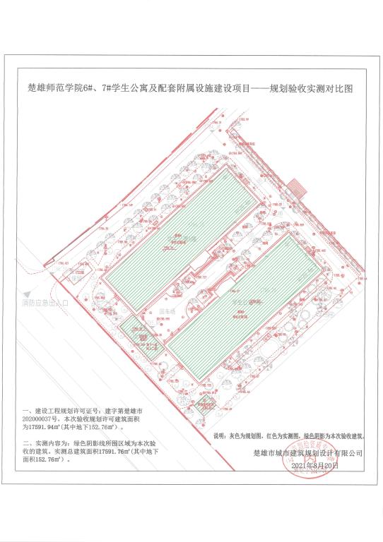 项目简介:楚雄师范学院建设的楚雄师范学院雁塔校区改建项目用地位于楚雄市老城区,西临鹿城南路,北临雁塔路,南临文鼎路,规划总用地面积191954.27㎡(合287.93亩),其修建性详细规划修改方案于2020年4月30日审定。楚雄师范学院雁塔校区改建项目规划总建筑面积172828.67平方米,其中地上建筑面积121397.36㎡,地下建筑面积5741.07㎡,建筑密度21.41%,容积率0.87,绿地率31.4%。2020年5月楚雄师范学院根据审定的项目修建性详细规划,对雁塔校区改建项目6#、7#学生公寓及配套附属设施进行报建,并按程序办理了编号为建字第楚雄市202000037号的《建设工程规划许可证》,许可总建筑面积17591.94㎡,其中地上建筑面积17439.18平方米,地下建筑面积152.76㎡,其许可内容为:学生公寓两栋地上6层;活动室一栋地上2层,地下1层;柴油发电机房一栋地上1层。2021年8月楚雄师范学院向我局申请对已竣工的6#学生公寓、7#学生公寓、活动室及柴油发电机房进行规划核实验收,经测绘单位实测和现场比对,6#、7#学生公寓及配套附属设施实测总建筑面积17591.76㎡,其中地上建筑面积17439平方米,地下建筑面积152.76㎡,建设规模符合《建设工程规划许可证》许可内容和审定规划,现拟对楚雄师范学院6#、7#学生公寓、柴油发电机房、活动室按照单体建筑工程进行规划核实验收。根据《楚雄州建设工程竣工规划验收管理办法》的有关规定特进行公示,如对楚雄师范学院6#、7#学生公寓及配套附属设施建设内容规划核实验收有异议的请在公示期限内与我局联系。
