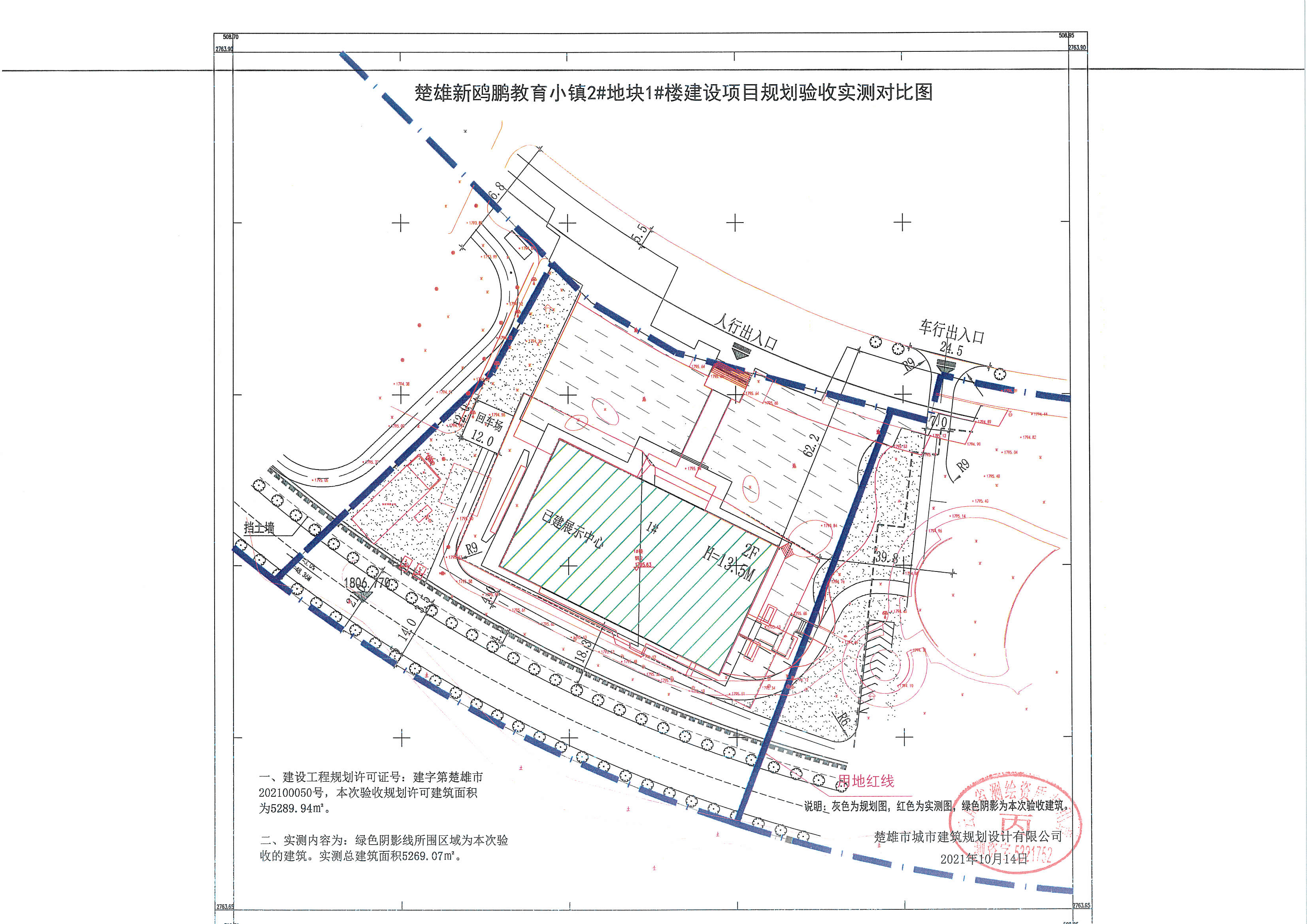 项目简介:云南楚鸥教育产业有限责任公司建设的楚雄新鸥鹏教育小镇一期建设项目2#地块1#楼项目用地位于楚雄市职教中心东南侧、茶花大道南侧。楚雄新欧鹏教育小镇一期建设项目2#地块修建性详细规划于2021年7月13日审定,2#地块一期规划用地面积15964.34㎡,规划总建筑面积5289.94㎡,计容总建筑面积10505.5㎡,建筑密度19.84%,容积率0.658,绿地率35.61%。2021年7月30日云南楚鸥教育产业有限责任公司根据审定的项目修建性详细规划向楚雄市行政审批局申请办理了楚雄新鸥鹏教育小镇2#地块1#楼《建设工程规划许可证》,编号为建字第楚雄市202100050号,建筑面积5289.94㎡,许可内容为补办新鸥鹏2#地块1#楼(展示中心用房)一栋,钢框架结构,地上二层。2021年10月云南楚鸥教育产业有限责任公司向我局申请对已竣工的新鸥鹏2#地块1#楼(展示中心用房)进行规划核实验收,经测绘单位实测和现场比对,展示中心用房实测总建筑面积5269.07㎡,其建设规模符合《建设工程规划许可证》许可内容和审定规划,现拟对楚雄新鸥鹏教育小镇2#地块1#楼按照单体建筑工程进行规划核实验收。根据《楚雄州建设工程竣工规划验收管理办法》的有关规定特进行公示,如对楚雄新鸥鹏教育小镇2#地块1#楼内容规划核实验收有异议的请在公示期限内与我局联系。