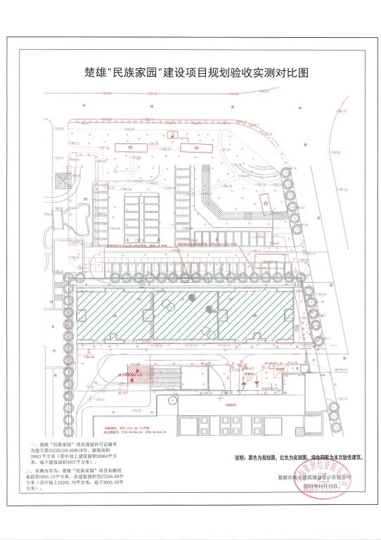 项目简介:楚雄“民族家园”建设项目用地位于楚雄市胜景路东侧,南临“回民文化中心”,东临云荷路,北临民族广场。楚雄富邦房地产开发有限公司报审的楚雄“民族家园”修建性详细规划于2013年10月审定实施,规划用地面积3993.33平方米,规划总建筑面积26964.12平方米,其中地上建筑面积23907.12平方米,地下建筑面积3057平方米,建筑密度39.968%,容积率5.9876,绿地率24.7%,机动车停车位共231个,其中地上停车位41个,地下停车位70个,清真寺提供120个。2014年1月24日楚雄富邦房地产开发有限公司取得楚雄“民族家园”建设项目《建设工程规划许可证》,编号为建字第532301201400018号,项目总建筑面积30021平方米,其中地上建筑面积26964平方米,地下建筑面积3057平方米,许可内容为:高层住宅2栋地上二十二层局部一层(其中一层为地上车库、单车房及物管办公用房)、地下车库一层。2021年8月楚雄富邦房地产开发有限公司向我局申请对楚雄“民族家园”建设内容进行规划核实验收,经测绘单位实测楚雄“民族家园”项目实测用地面积3993.33平方米,总建筑面积为27236.69平方米(其中地上24202.76平方米,地下3033.93平方米),计容建筑面积24202.76平方米,不计容建筑面积3033.93平方米,建筑密度40.006%,容积率6.0608,绿地率13.03%,机动车停车位共107个(其中地上停车位43个,地下停车位64个),并于B幢东侧增设燃气调压柜。经现场踏勘与规划比对核实,楚雄“民族家园”项目实测总建筑面积超出规划272.57平方米,计容建筑面积超出规划295.64平方米,容积率超出规划0.0741,超出地块规划设计条件容积率0.0608,建筑密度超出规划0.038%,绿地率低于规划11.67%(绿地面积不足468.86平方米);机动车停车位总个数少于规划124辆(由于清真寺实际实施机动车停车位不足,因此无法提供120辆);项目存在A-203、A-204、B-201、B-202、B-203、B-204共6户侵占公共露台违章建设行为。目前,项目部分经济技术指标和配套设施不符合规划许可及审定规划内容等情况正在向该小区业主征求意见。根据《中共楚雄市委办公室 楚雄市人民政府办公室印发<关于推进房地产领域矛盾化解工作实施方案>的通知》《楚雄市人民政府办公室关于进一步加快推进房地产领域矛盾化解工作的通知》等文件要求及《楚雄州建设工程竣工规划验收管理办法》规定特进行公示,如对楚雄“民族家园”建设内容规划核实验收有异议的请在公示期限内与我局联系。