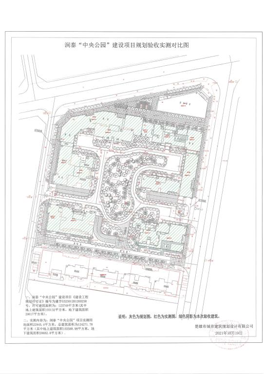 项目简介:润泰“中央公园”建设项目用地位于楚雄市北浦路与航空路交叉口,南临北浦嘉园小区,东临航空路,北临北浦路。楚雄润泰置业投资开发有限公司报审的润泰“中央公园”修建性详细规划于2012年11月审定实施,规划用地面积22945.4平方米,规划总建筑面积123748.47平方米(其中地上建筑面积103131.47平方米,地下建筑面积20617平方米),建筑密度34.99%,容积率4.49,绿地率30.29%,机动车停车位967个(其中地上停车位22个,地下停车位945个)。2012年11月16日楚雄润泰置业投资开发有限公司取得了润泰“中央公园”建设项目《建设工程规划许可证》,编号为建字第532301201200238号,许可建筑面积为123749平方米(其中地上建筑面积103132平方米,地下建筑面积20617平方米),许可内容为:高层住宅3栋地上三十三层、高层住宅3栋地上二十八层、商业一栋地上四层、地下车库一层。2021年8月楚雄润泰置业投资开发有限公司向我局申请对润泰“中央公园”项目建设内容进行规划核实验收,经测绘单位实测润泰“中央公园”项目实测用地面积22945.4平方米,总建筑面积为124271.78平方米(其中地上建筑面积103588.98平方米,地下建筑面积20682.8平方米),计容建筑面积103588.98平方米,不计容建筑面积20682.8平方米,建筑密度35.62%,容积率4.515,绿地率17.77%,机动车停车位452个(均为地下),并于A幢北侧增设燃气调压柜,G幢南侧增设箱变。经现场踏勘与规划比对核实,润泰“中央公园”项目建设实测总建筑面积超出规划许可建筑面积522.78平方米,计容建筑面积超出规划457.51平方米,容积率超出规划0.025,超出地块规划设计条件容积率0.015,建筑密度超出规划0.63%,绿地率低于规划12.52%(绿地面积不足2871.87平方米);机动车停车位少于规划515个;C-305房屋侵占二楼公共屋面搭建实体房屋,A-301及B-301房屋侵占二楼公共屋面搭建雨棚;项目非机动车停车区、C栋公厕、物管办公用房、社区医疗站、会所、垃圾收集房等配套设施位置及规模与规划不符。目前,项目部分经济技术指标和配套设施不符合规划许可及审定规划内容等情况正在向该小区业主征求意见。根据《中共楚雄市委办公室 楚雄市人民政府办公室印发<关于推进房地产领域矛盾化解工作实施方案>的通知》《楚雄市人民政府办公室关于进一步加快推进房地产领域矛盾化解工作的通知》等文件要求及《楚雄州建设工程竣工规划验收管理办法》规定特进行公示,如对润泰“中央公园”建设内容规划核实验收有异议的请在公示期限内与我局联系。