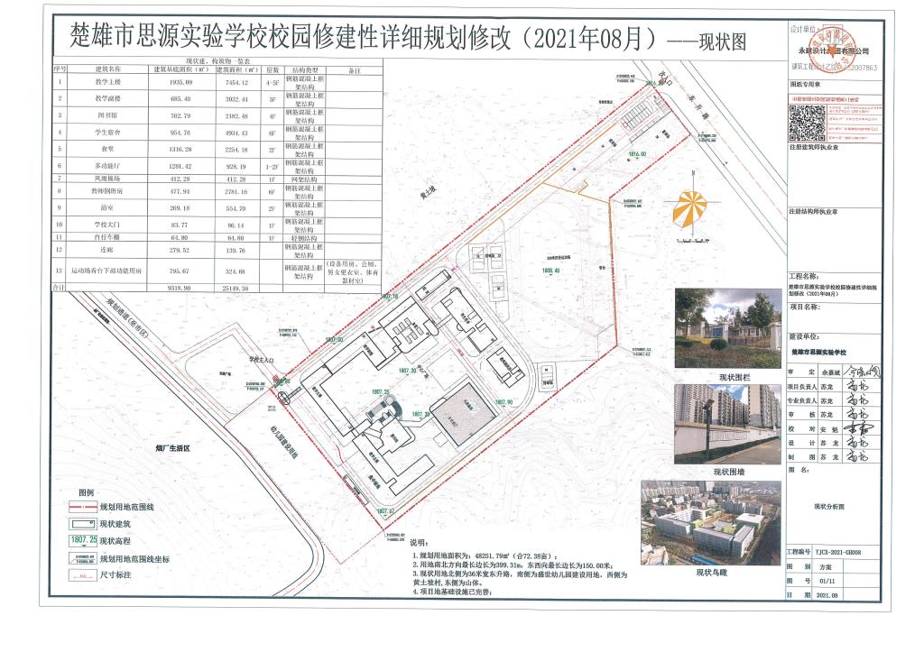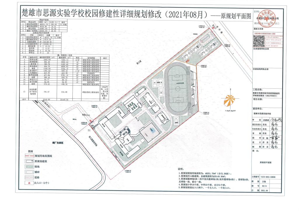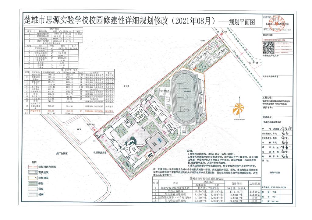 项目简介:楚雄市思源实验学校校园项目用地位于楚雄市东南新城片区东部,地块东临东升路,西临盛世幼儿园用地,北临阳光花园小区和现状村庄,规划用地面积72.38亩,该项目修建性详细规划于2015年1月审定实施,现楚雄市思源实验学校提出在交通、消防、竖向设计等不变,各项经济技术指标满足相关规范要求、技术标准的前提下,对校园修建性详细规划进行修改。
