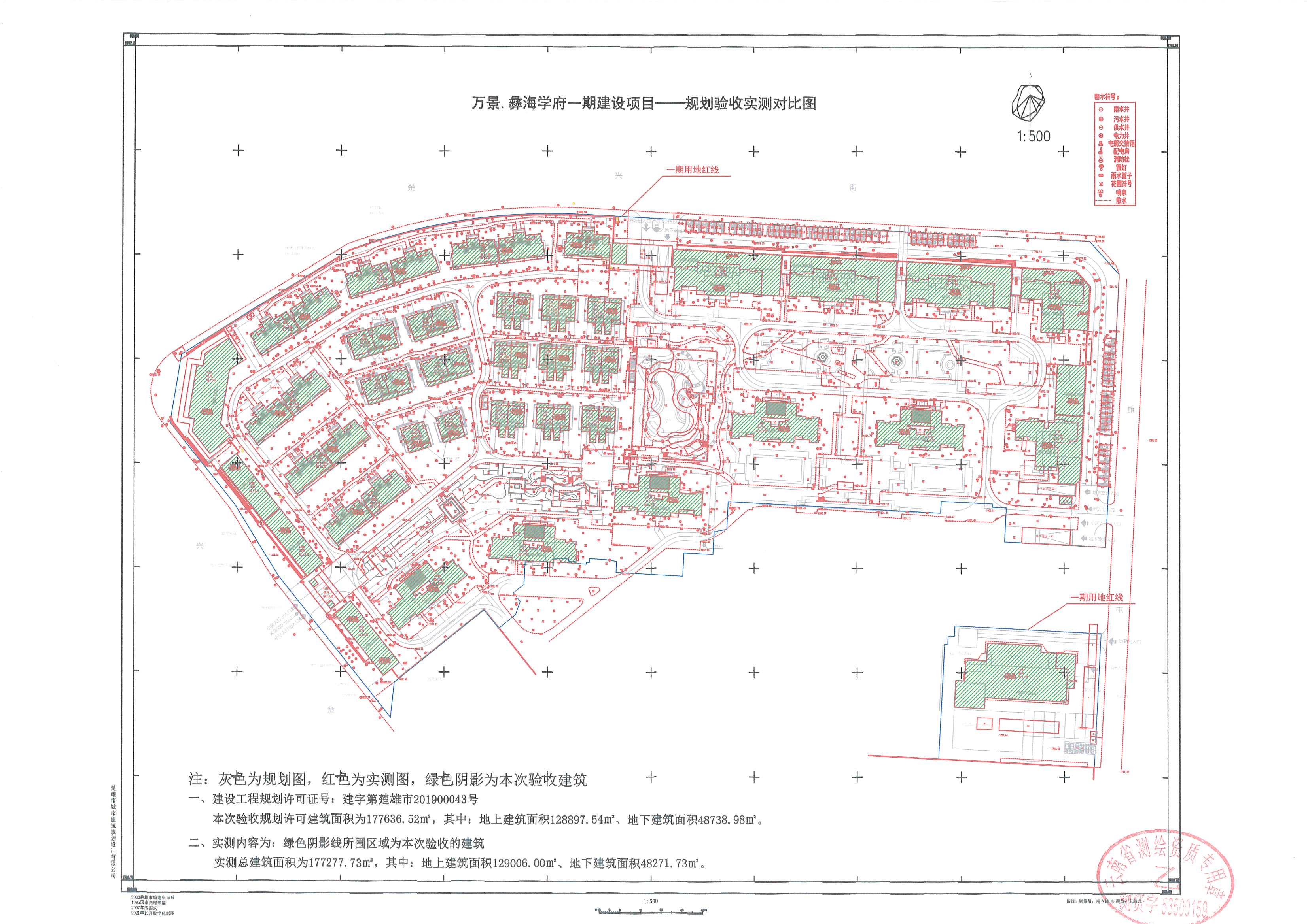 2021年12月楚雄市万腾房地产有限公司向我局申请对已竣工的万景彝海学府一期建设项目进行规划核实验收,经测绘单位实测和现场比对,该项目实测用地面积73551.47㎡,建筑面积177277.73㎡,