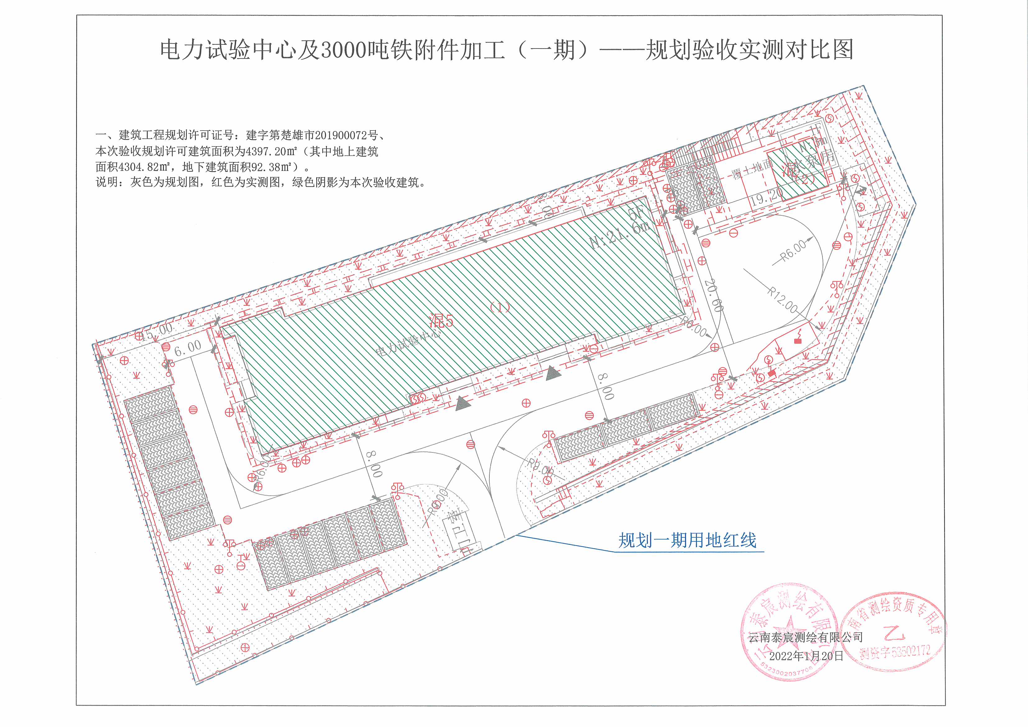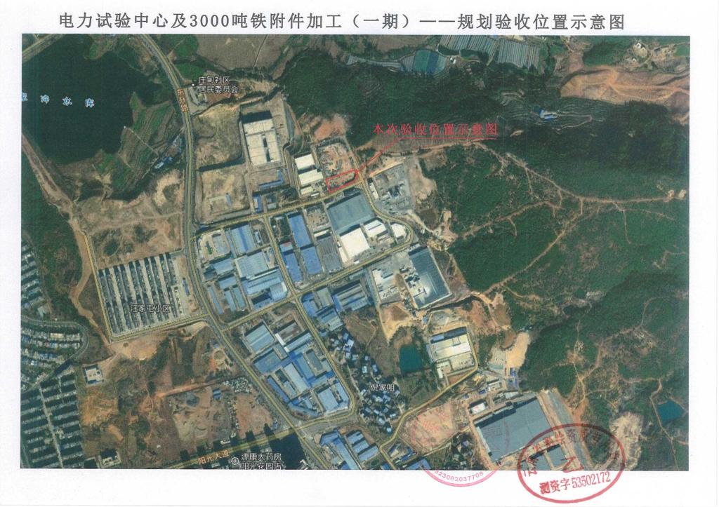 电力试验中心及3000吨铁附件加工(一期建设)建设项目规划用地面积3678.48㎡,规划总建筑面积4265.87㎡,其中计容建筑面积4265.87㎡,建筑密度23.51%,容积率1.15,绿地率23.68%,机动车停车位17个。2019年8月16日建设方根据审定的修建性详细规划办理了电力试验中心及3000吨铁附件加工(一期建设)建设项目《建设工程规划许可证》,编号为建字第楚雄市201900072号,建筑面积4397.2㎡(其中地下面积92.38㎡),许可内容为:电力试验中心(综合楼)一栋地上5层;消防水池及泵房一栋地上1层地下1层。