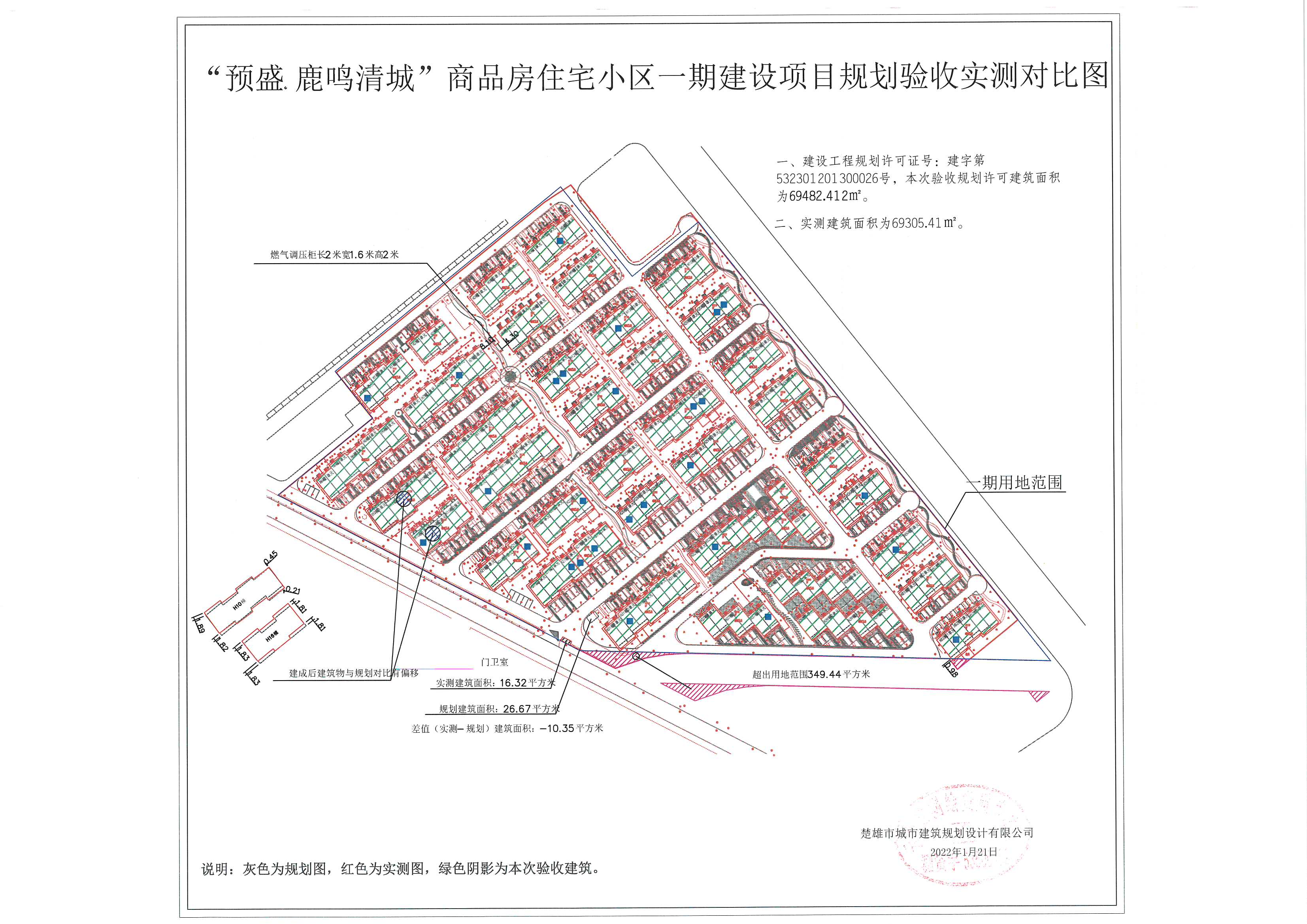 2022年1月楚雄市预盛房地产开发有限公司管理人向我局申请对已竣工的“预盛·鹿鸣清城”商品房住宅小区一期建设项目进行规划核实验收,经测绘单位实测,该项目实测用地面积75050.27㎡,总建筑面积69305.41㎡,其中地上计容建筑面积69305.41㎡,建筑密度33.06%,容积率0.92,绿地率17.87%,机动车停车位265个。