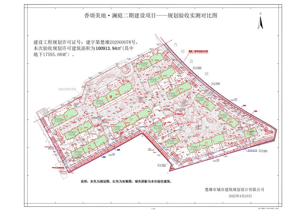 项目简介:楚雄市盛鑫祥房地产开发有限公司开发建设的香颂美地·澜庭建设项目位于瑞东路东侧,楚风苑小区南侧,规划总用地面积106773.56㎡,其修建性详细规划于2020年1月13日审定,分两期实施建设,其中香颂美地·澜庭一期建设项目于2021年12月21日通过规划核实验收,香颂美地·澜庭二期建设项目修改方案于2020年6月30日审定实施。2022年3月8日因设计变更一期及二期项目总建筑面积为212594.22㎡,减少1183.52㎡,其中地上建筑面积170825.85㎡(为计容建筑面积),地下建筑面积41768.37㎡,容积率1.6,建筑密度24.84%,绿地率36.74%,机动车停车位1253个(地上停车位343个,地下停车位910个)。香颂美地·澜庭建设项目(二期)规划用地面积48771.73㎡,总建筑面积100913.94㎡(2022年3月8日因设计变更总建筑面积减少1183.52㎡),其中地上建筑面积83318.26㎡(为计容建筑面积,2022年3月8日因设计变更增加计容建筑面积49.78㎡),地下建筑面积17595.68㎡(因设计变更减少地下车库重叠部分建筑面积1233.3㎡),容积率1.708,建筑密度23.39%,绿地率36.09%,机动车停车位568个(地上停车位167个,地下停车位401个)。2020年8月项目建设单位根据审定的项目修建性详细规划,办理了香颂美地·澜庭二期建设项目《建设工程规划许可证》(编号为建字第楚雄市202000078号),经设计变更后规划许可总建筑面积100913.94㎡,其中地上建筑面积83318.26㎡,地下建筑面积17595.68㎡,其许可内容为:多层住宅七栋地上9层;多层住宅两栋地上9层地下1层;高层住宅五栋地上十一层;地下车库一座地下一层。2022年4月楚雄市盛鑫祥房地产开发有限公司向我局申请对已竣工的香颂美地·澜庭二期项目建设内容进行规划核实验收,经测绘单位实测和现场比对审核,香颂美地·澜庭二期建设项目实测用地面积48771.73㎡,总建筑面积100902.35㎡,其中地上建筑面积83305.7㎡(为计容建筑面积),地下建筑面积17596.65㎡,建筑密度23.34%,容积率1.708,绿地率41.97%,此外实测机动车停车位共631个(地上停车位200个,地下停车位431个),二期项目实测停车位总个数比规划多63个,其中需补足一期不足的50个。现该项目一期及二期均已实施完毕,经审核整体经济技术指标及公建配套、工程管线等符合该项目规划,根据《楚雄彝族自治州建设工程竣工规划验收管理办法》的规定特进行公示,如对香颂美地·澜庭二期建设项目规划核实验收有异议的请在公示期限内与我局联系。