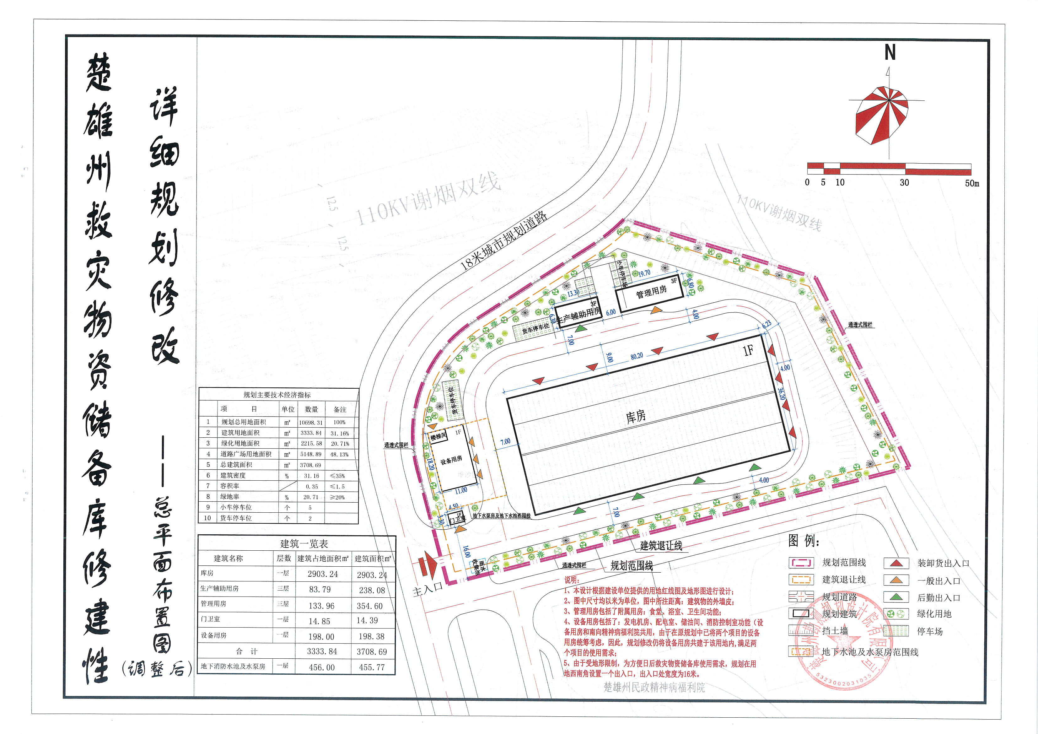 项目简介:楚雄州救灾物资储备库项目用地位于楚雄市东南新城东部,地块东临110KV谢烟双线,南临楚雄州民政精神病人福利院项目,西、北临18米规划道路,规划用地面积16.05亩。该项目修建性详细规划修改于2018年10月15日审定实施,现楚雄彝族自治州发展和改革委员会提出在保持该项目经济技术指标、建筑设计方案等均不变,且满足相关规范要求、技术标准的前提下,对该项目修建性详细规划修改设计方案进行变更。变更的具体内容为: