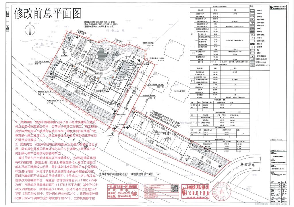 二、由于挡墙的影响及机动车停车位的调整,6号地块绿地面积由1176.32㎡调整为1102.26㎡,减少74.06㎡;绿地率由29.54%调整为27.68%减少1.86%。