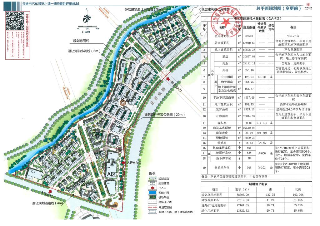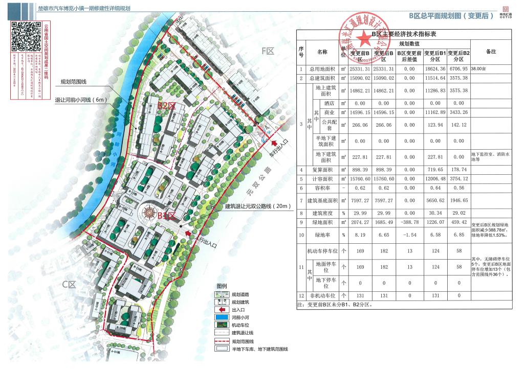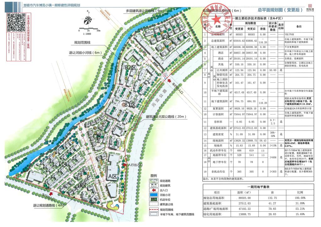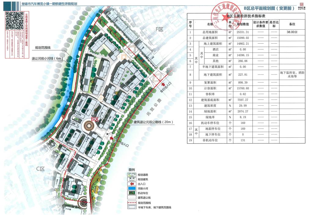 项目简介:楚雄市汽车博览小镇一期项目用地位于楚雄市西北部,地块东临元双公路,南临现状空地,西临河前小河,北临尚亿·紫溪壹号项目用地,规划用地面积132.75亩,该项目修建性详细规划于2021年6月审定实施(项目分为A、B、C、D、E、F六区实施建设)。现楚雄伟光汇通汽车博览产业发展有限公司提出,在保持项目规划布局等基本不变,且所有经济技术指标均满足相关规范要求的前提下,对楚雄市汽车博览小镇一期修建性详细规划B区、F区进行如下变更: