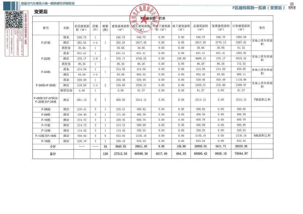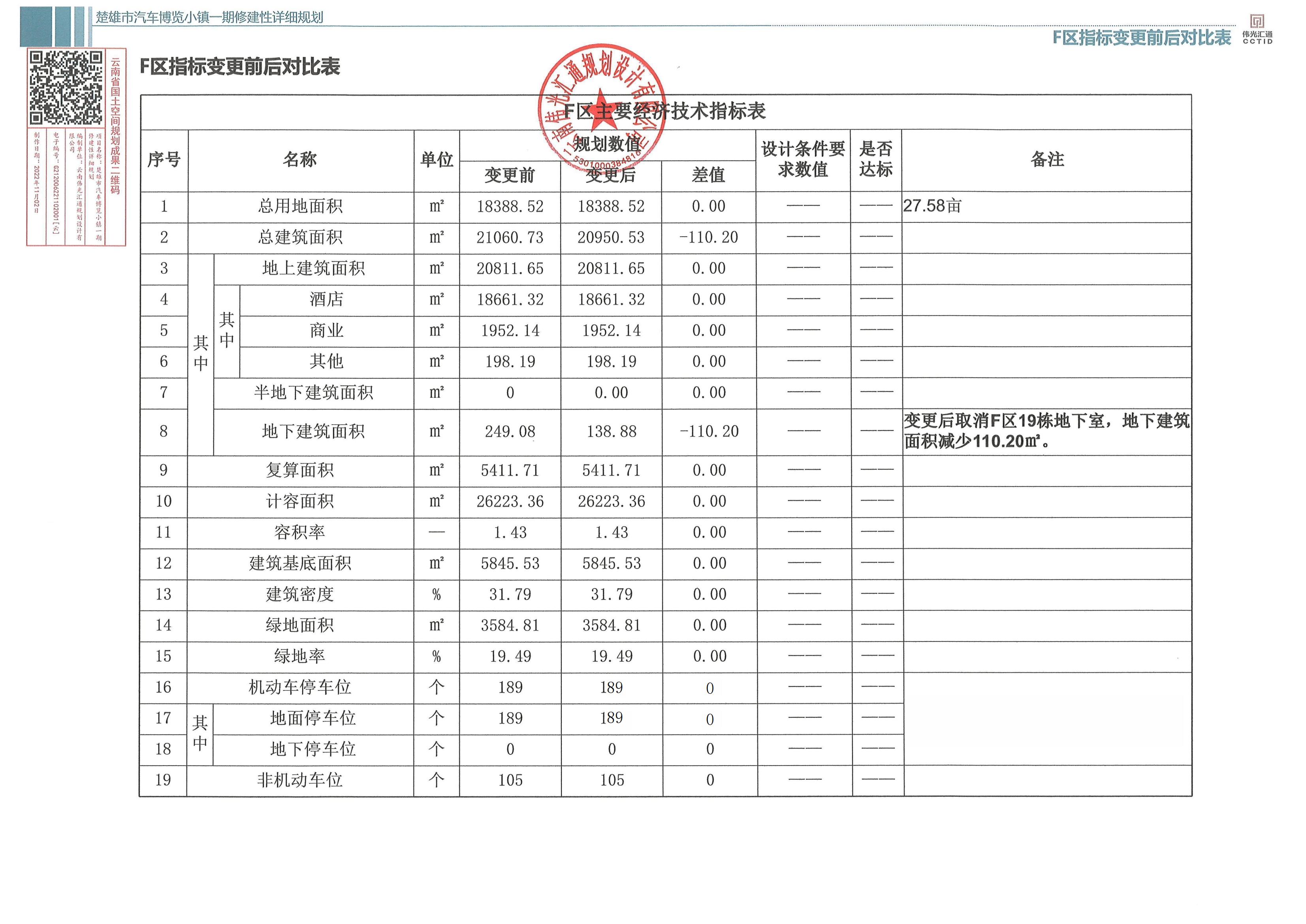 3.取消F19栋的地下室110.20㎡,F区地下建筑面积由249.08㎡调整为138.88㎡,减少110.20㎡;F区总建筑面积由21060.73㎡调整为20950.53㎡,减少110.20㎡;一期项目地下建筑面积由794.75㎡调整为684.55㎡,减少110.20㎡;一期项目总建筑面积由65910.62㎡调整为65800.42㎡,减少110.20㎡。