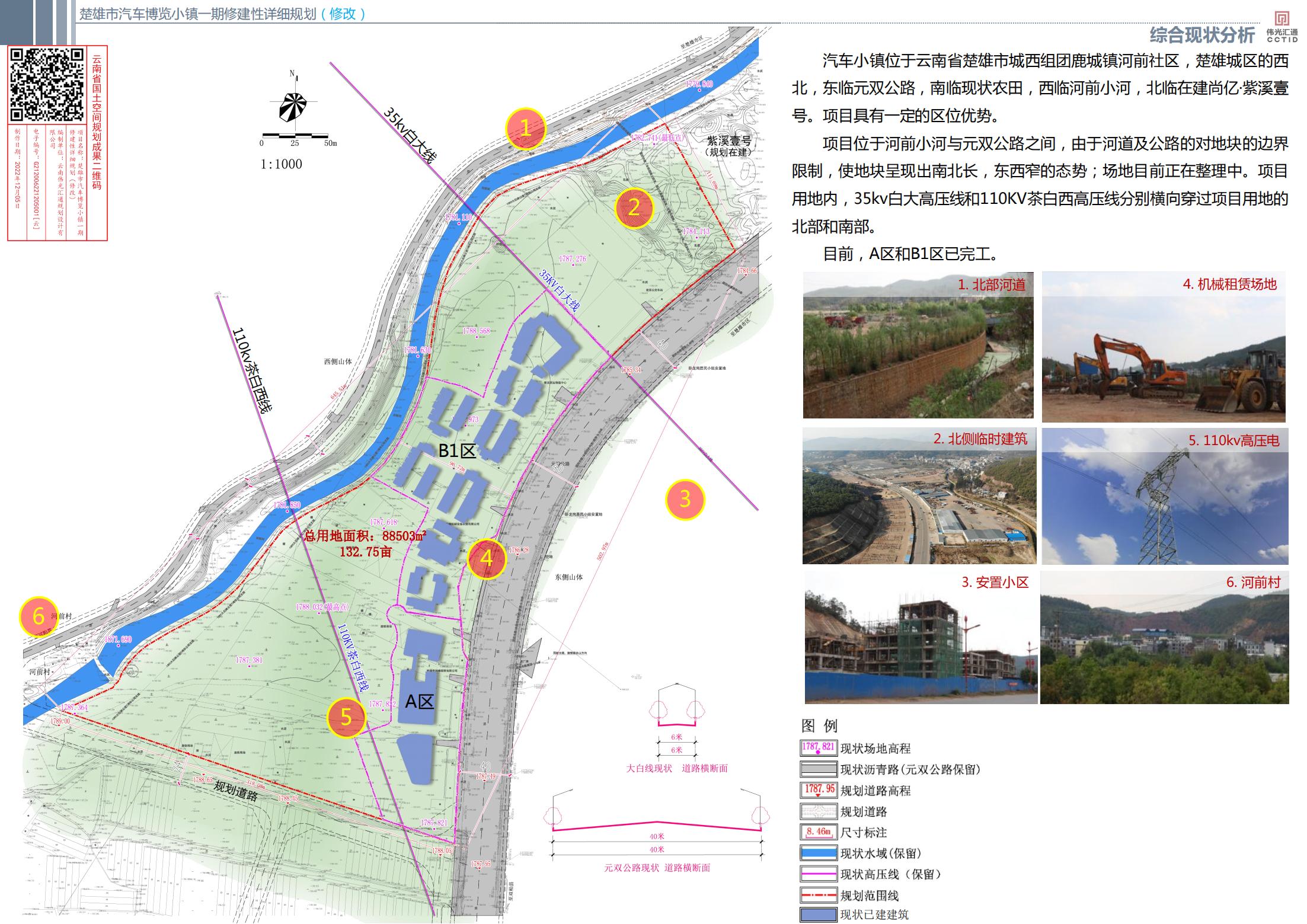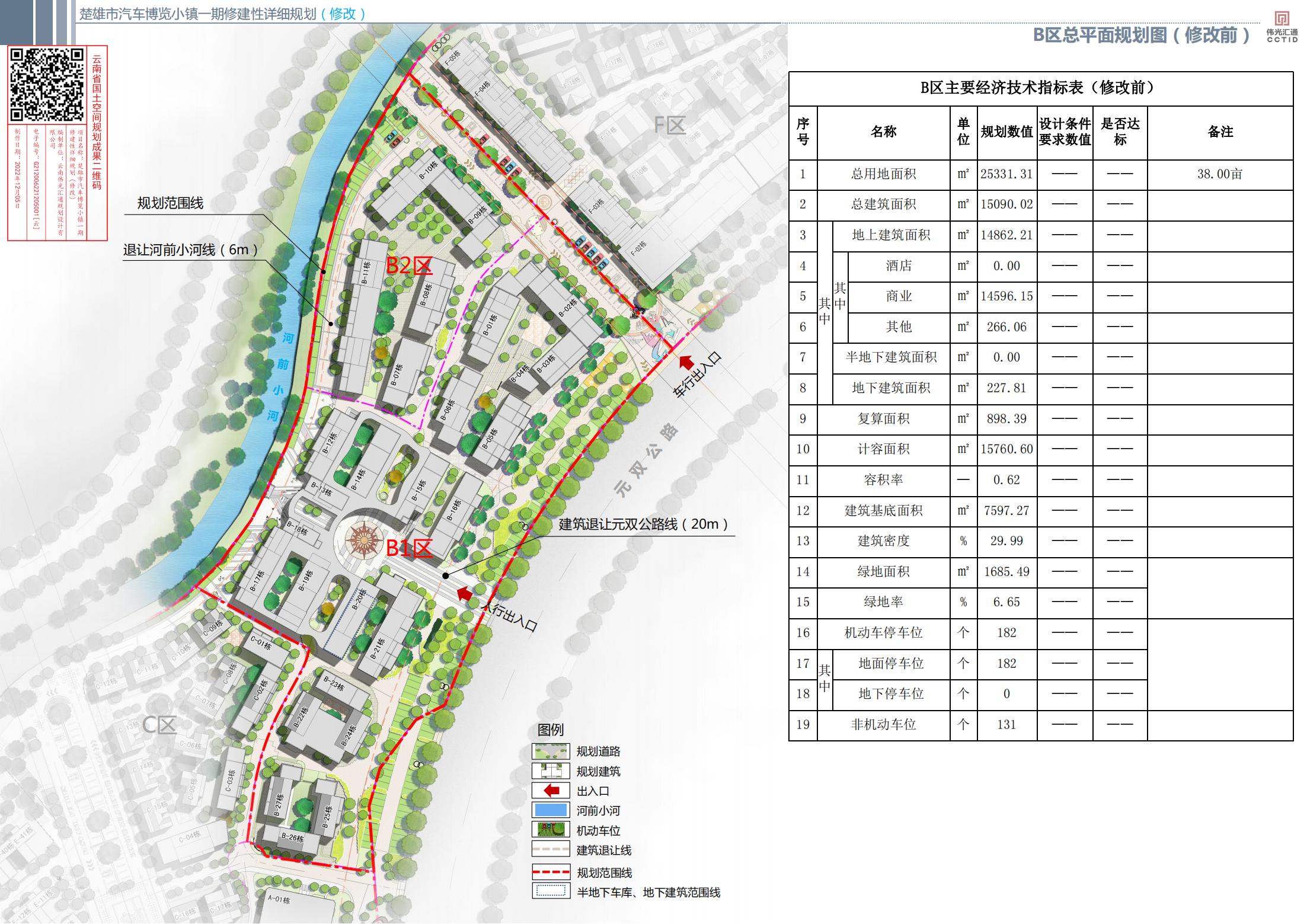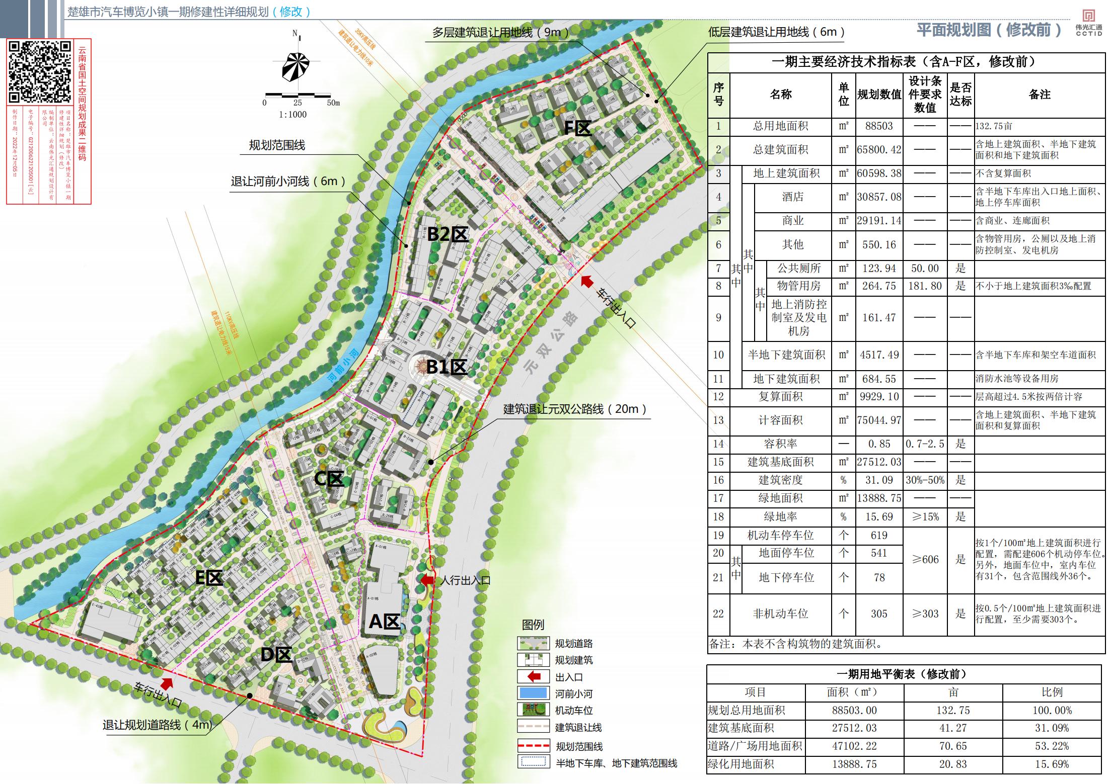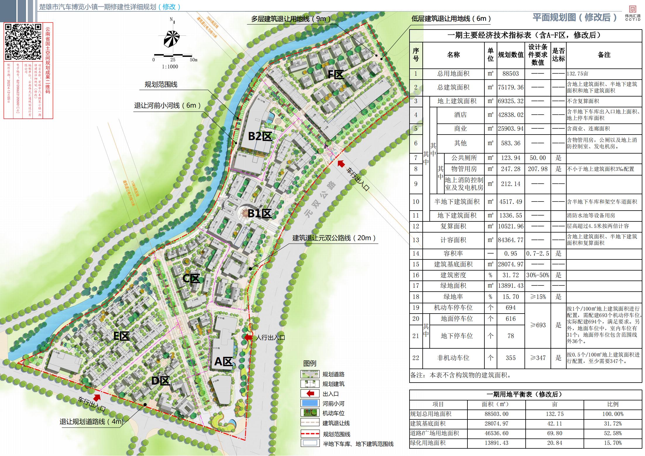 项目简介:楚雄市汽车博览小镇一期项目用地位于楚雄市西北部,地块东临元双公路,南临现状空地,西临河前小河,北临尚亿·紫溪壹号项目用地,规划用地面积132.75亩,该项目修建性详细规划于2021年6月审定实施,分为A、B1、B2、C、D、E、F区实施建设,A区已通过规划核实验收。现楚雄伟光汇通汽车博览产业发展有限公司提出在各项经济技术指标均满足相关规范要求、技术标准的前提下,对该项目修建性详细规划进行修改。