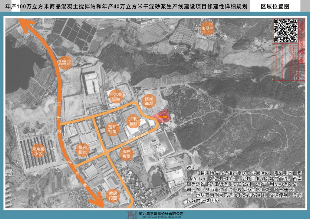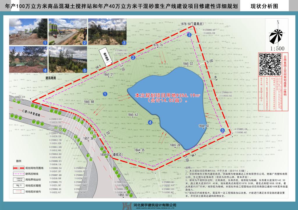 项目简介:年产100万立方米商品混凝土搅拌站和年产40万立方米干混砂浆生产线建设项目用地位于楚雄工业园富民庄甸工业区富民片区,地块东临现状空地,南临18米规划道路,西临18米现状道路,北临建昆商混项目用地,规划用地面积为14.03亩。通过规划拟新建混凝土搅拌站及其配套设施。