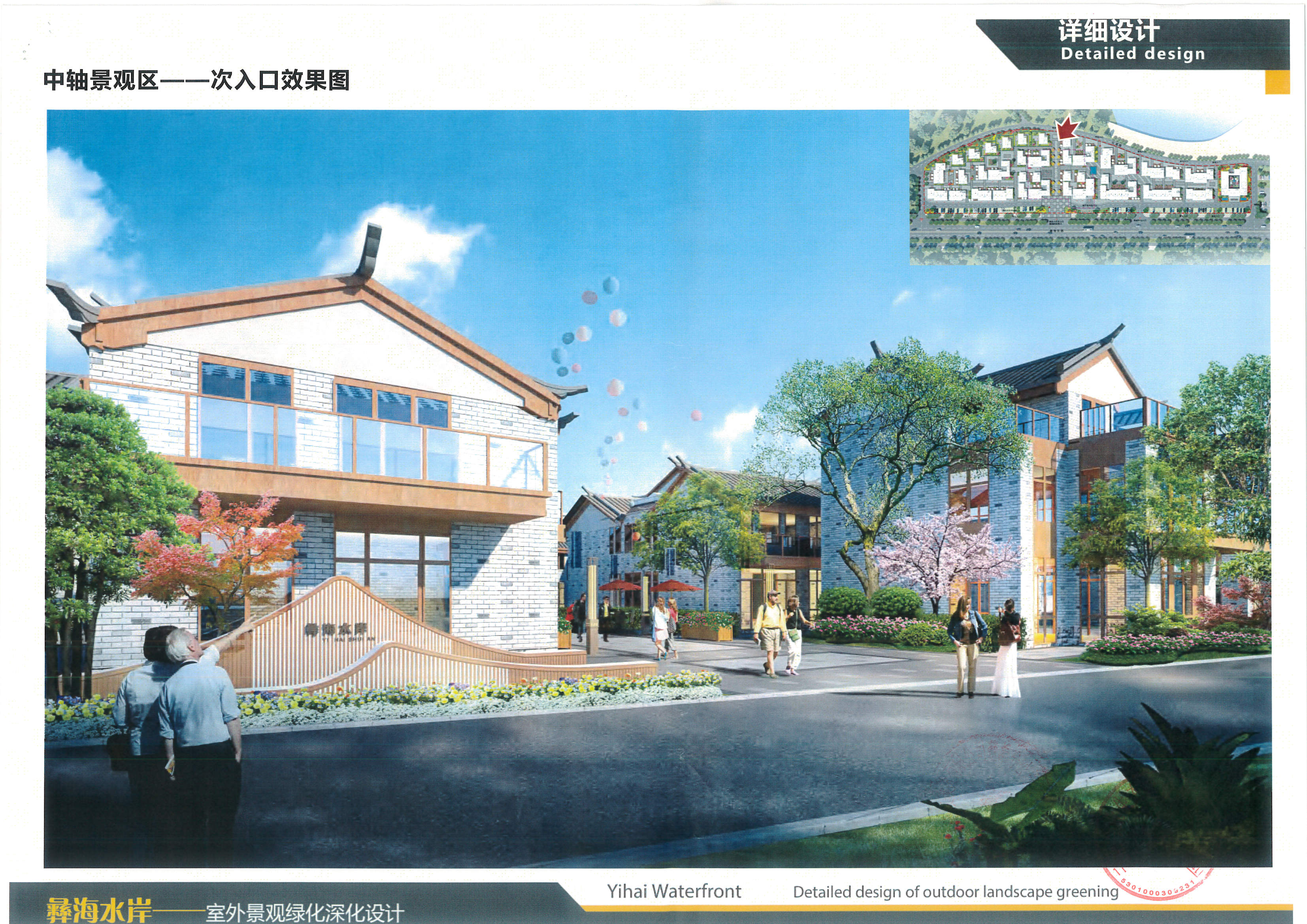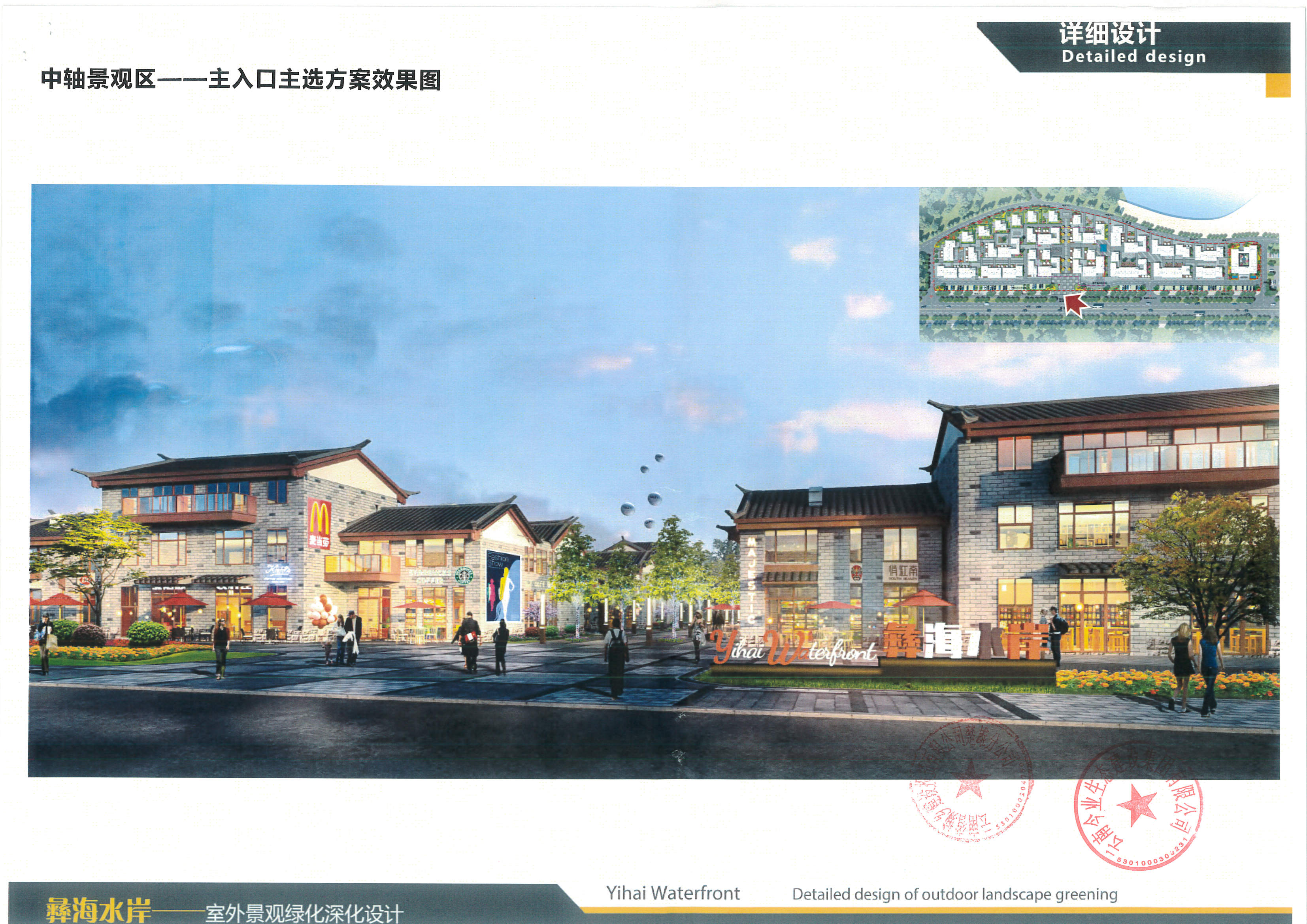 取消原规划中临彝海东路一侧主出入口设置的大门,改为项目案名小品;同时,在该项目临彝海公园一侧的次出入口新增案名小品。