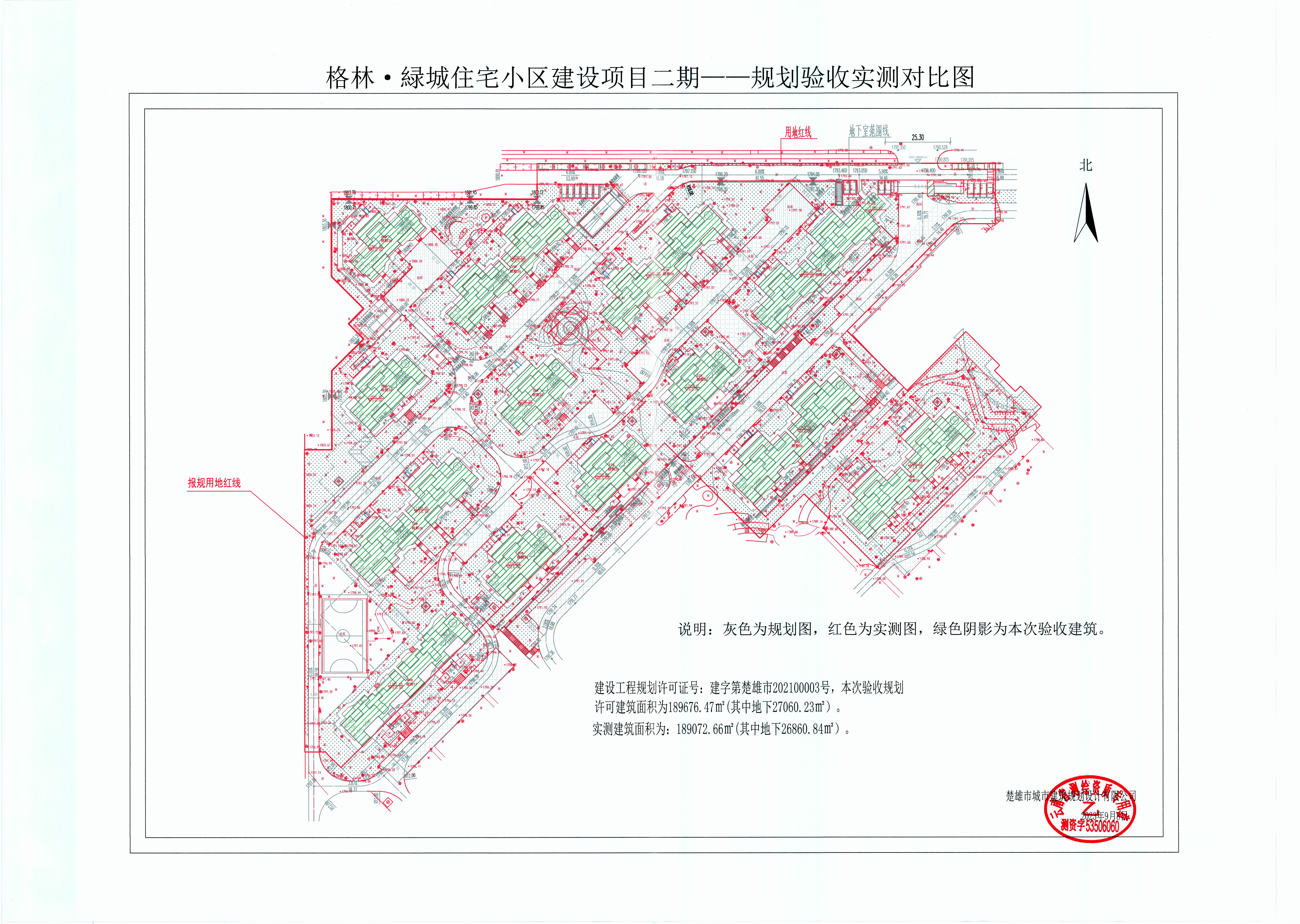 项目简介:格林緑城住宅小区建设项目位于楚雄市鹿城镇花果山片区南端(原楚雄铁合金厂片区),东临雄宝路,南临铜鼓路,西临鹿城南路和铜鼓公园,北临万家坝路。格林緑城住宅小区一期、二期建设项目修建性详细规划于2020年9月17日审定,修改方案于2023年7月17日审定,规划总用地面积113482.41㎡,总建筑面积406907.74㎡,其中地上建筑面积324476.00㎡(为计容建筑面积),地下建筑面积82431.74㎡(为不计容建筑面积),容积率2.86,建筑密度21.15%,绿地率38.38%,机动车停车位2379个(地上停车位85个,地下停车位2294个)。其中格林緑城住宅小区建设项目(一期)(含幼儿园)于2022年1月24日通过规划验收,此次验收的内容为格林緑城住宅小区建设项目(二期)。格林緑城住宅小区建设项目(二期)规划用地面积37760.77㎡,总建筑面积189676.47㎡,其中地上建筑面积162616.24㎡(为计容建筑面积),地下建筑面积27060.23㎡(为不计容建筑面积),容积率4.31,建筑密度23.33%,绿地率32.45%,机动车停车位695个(地上停车位25个,地下停车位670个)。2021年1月19日项目建设单位根据审定的项目修建性详细规划,办理了格林緑城住宅小区建设项目(二期)《建设工程规划许可证》(编号为建字第楚雄市202100003号),二期规划许可总建筑面积189676.47㎡(其中地上建筑面积162616.24㎡,地下建筑面积27060.23㎡),其许可内容为:高层住宅十二栋地上26层;高层住宅一栋地上17层;公共配套用房一栋地上1层;大门一栋地上1层;二期地下室一座地下1层。