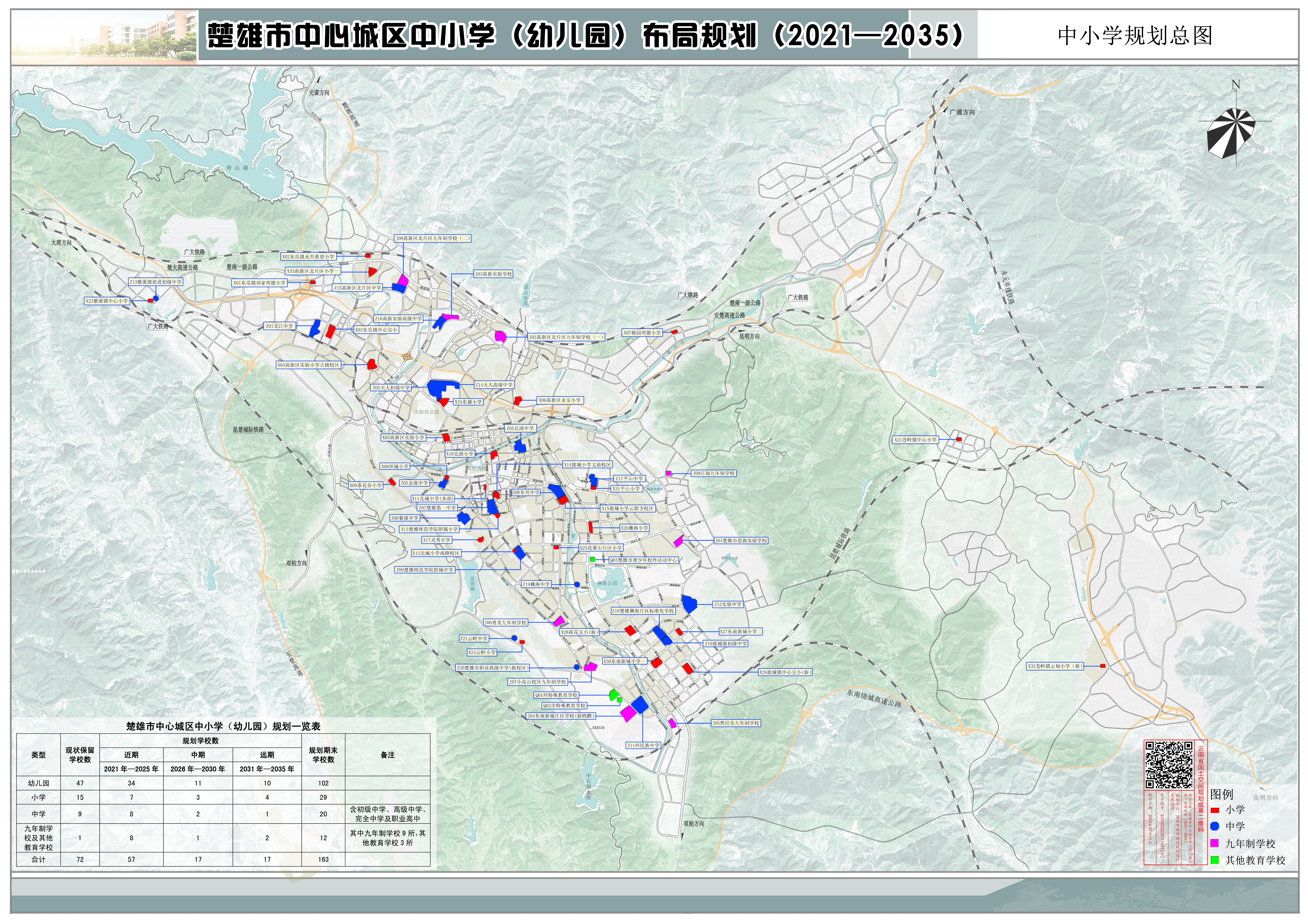 项目简介:为进一步整合教育资源,加快推进学校标准化建设步伐,努力提高办学水平,促进城乡教育均衡发展,确保学校布局更加科学、合理,办学规模逐步与人口增长及经济发展相适应,充分满足人民群众对优质教育资源的需求,围绕楚雄市中心工作和经济社会发展需要,普遍提高全民教育体育水平,加强人力资源开发,全面完成教育体育领域综合改革和实现教育现代化向纵深推进,全面贯彻制定党和国家的教育方针,全面落实立德树人根本任务,进一步推进教育公平和促进教育优质均衡发展。根据《楚雄市国民经济和社会发展第十四个五年规划纲要》《云南省教育现代化2035》和《楚雄市教育现代化2035》,结合楚雄市工作实际,楚雄市组织编制了《楚雄市城区中小学(幼儿园)布局规划(2021—2035)》。