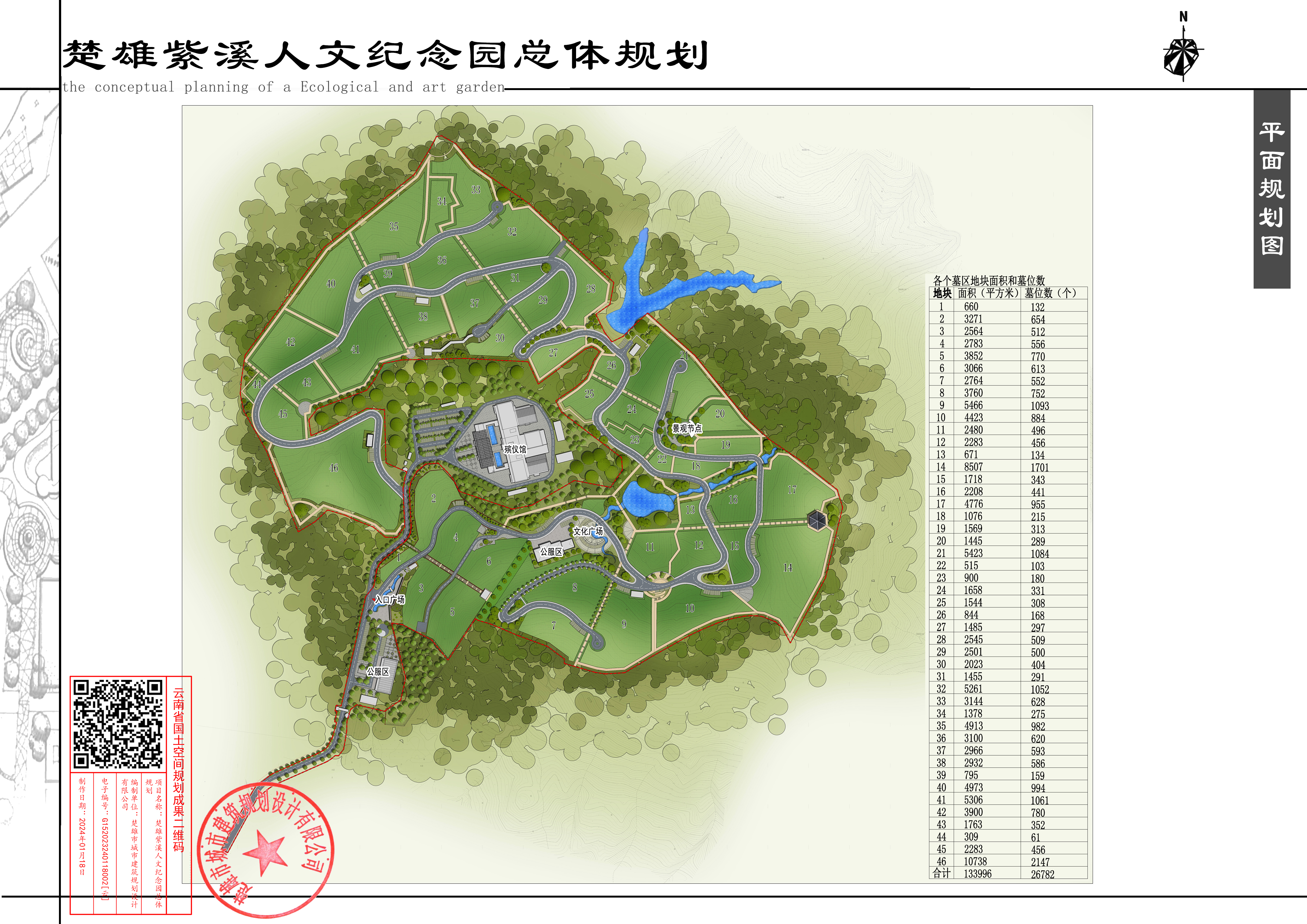 项目简介:楚雄紫溪人文纪念园位于楚雄市紫溪镇箐上村委会白石嘴山头,总用地面积约373.41亩(24.8950公顷)。整个纪念园由综合办公服务区、山体景观区、墓葬区以及滨水景观区四个功能结构区构成,墓葬区用地共规划地块46个,133996平方米,规划共计墓穴数为26782个。楚雄紫溪人文纪念园计划分为八期实施建设。