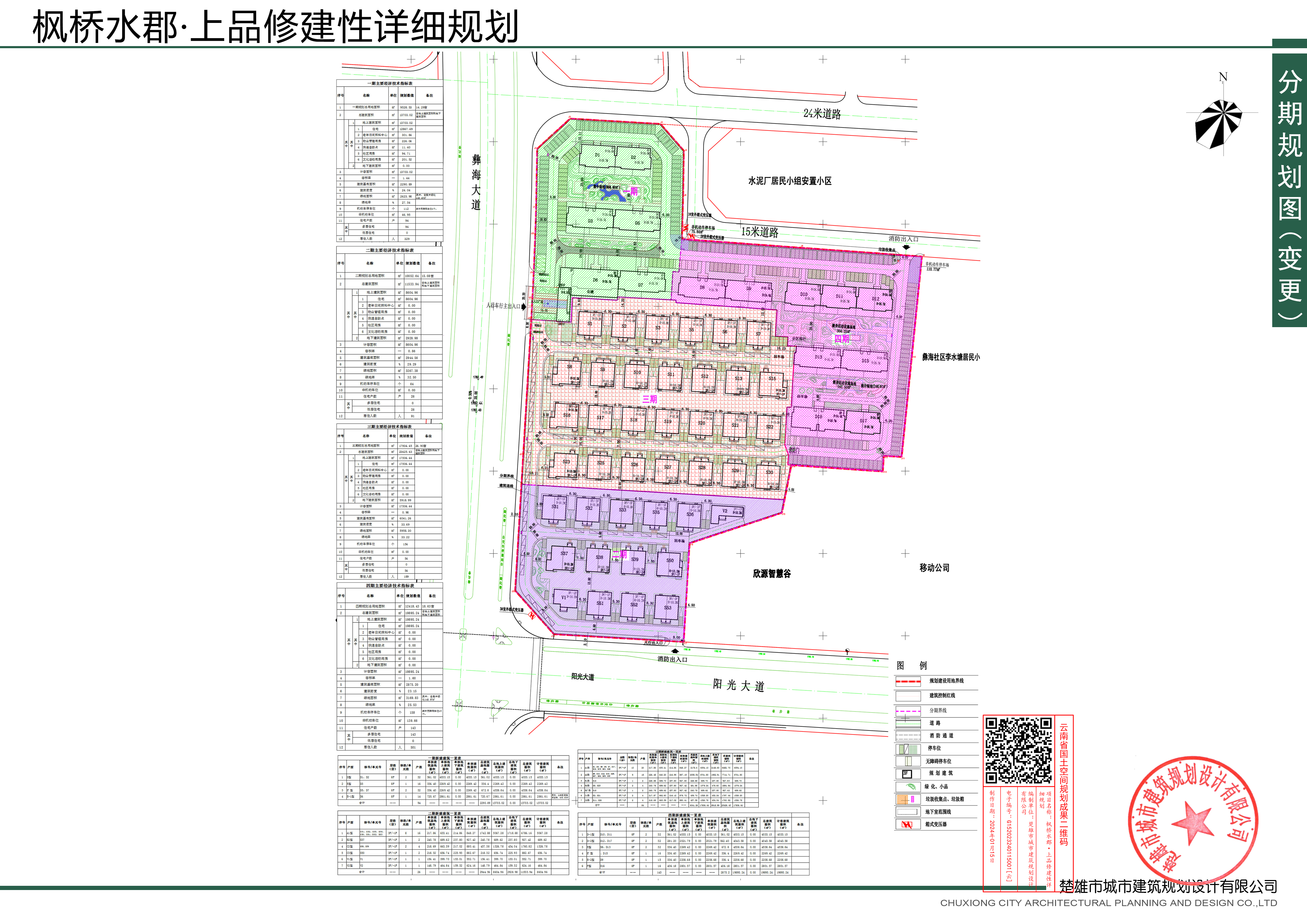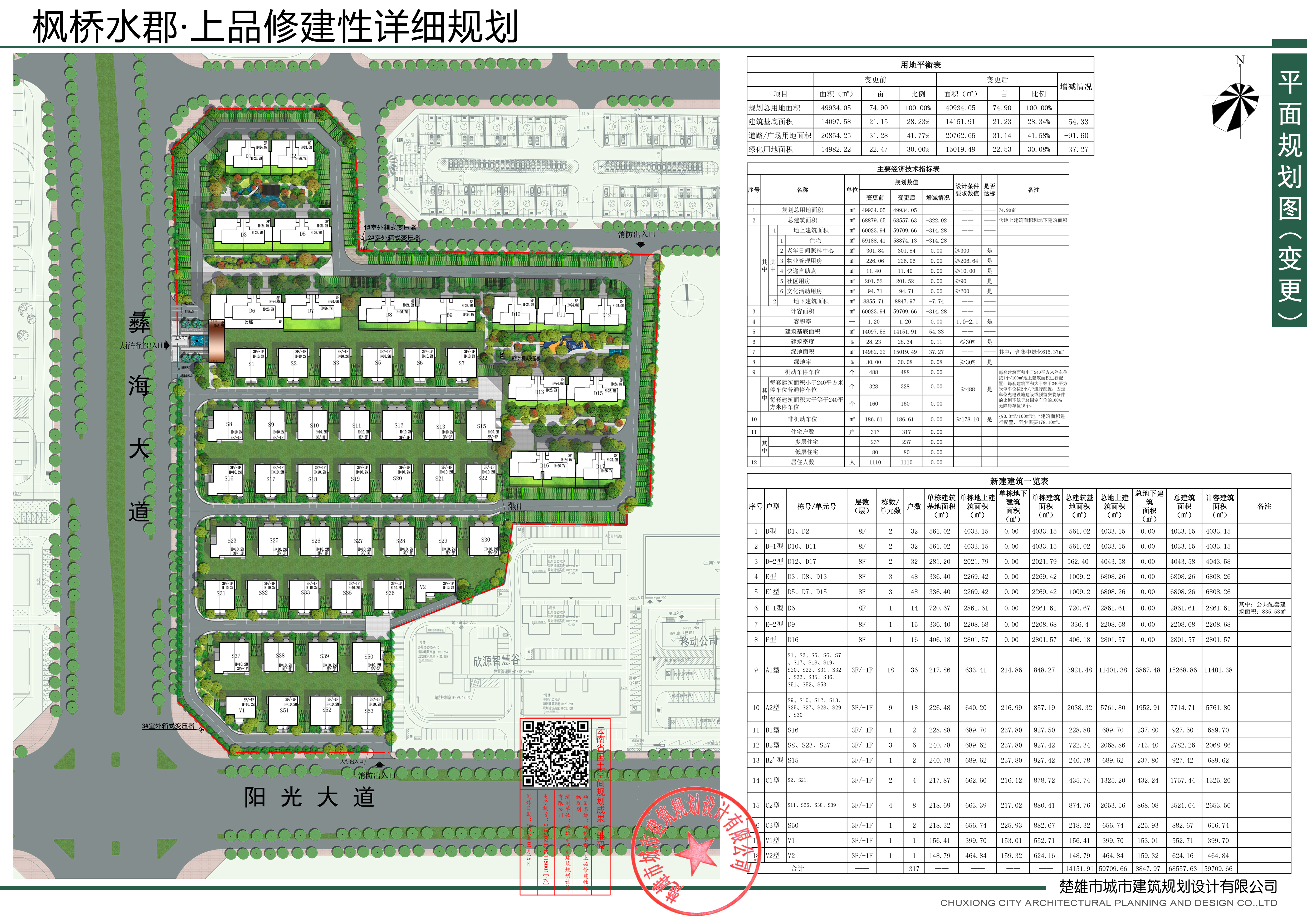 项目简介:枫桥水郡·上品项目用地位于楚雄市东南新城中西部,地块东临鹿城镇彝海社区李水塘安置小区,南临欣源智汇谷项目和阳光大道,西临彝海大道,北临15米规划道路和24米规划道路,规划用地面积74.90亩。该项目修建性详细规划于2024年1月审定实施,现楚雄丰邦致禾置业有限公司提出,为顺应市场需求,申请在保持总平面布局基本不变,各项经济技术指标均满足相关规范、技术标准及设计条件要求等的前提下,对该项目修建性详细规划进行如下变更:
