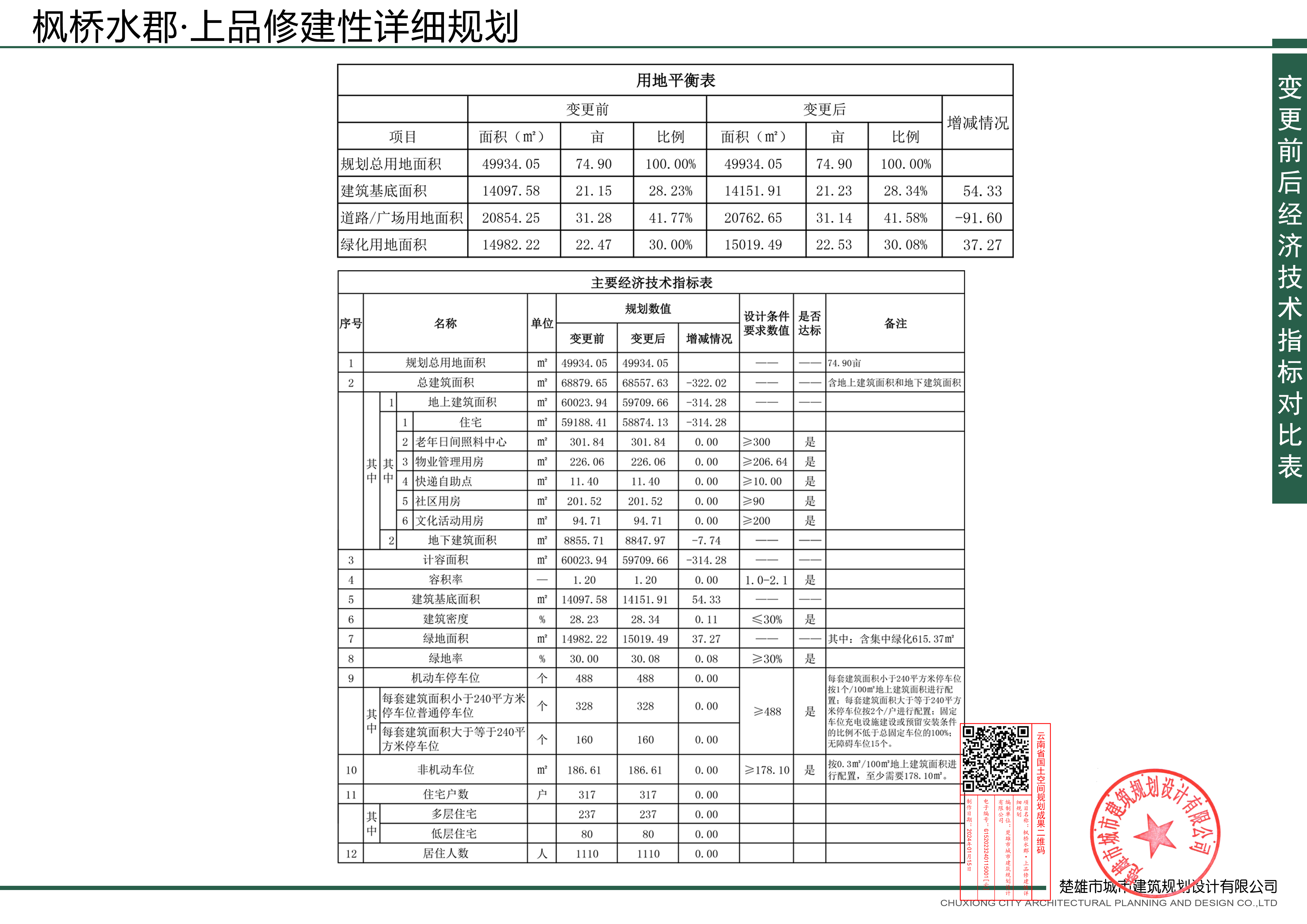 枫桥水郡·上品修建性详细规划(变更)修改前后经济技术指标对比表