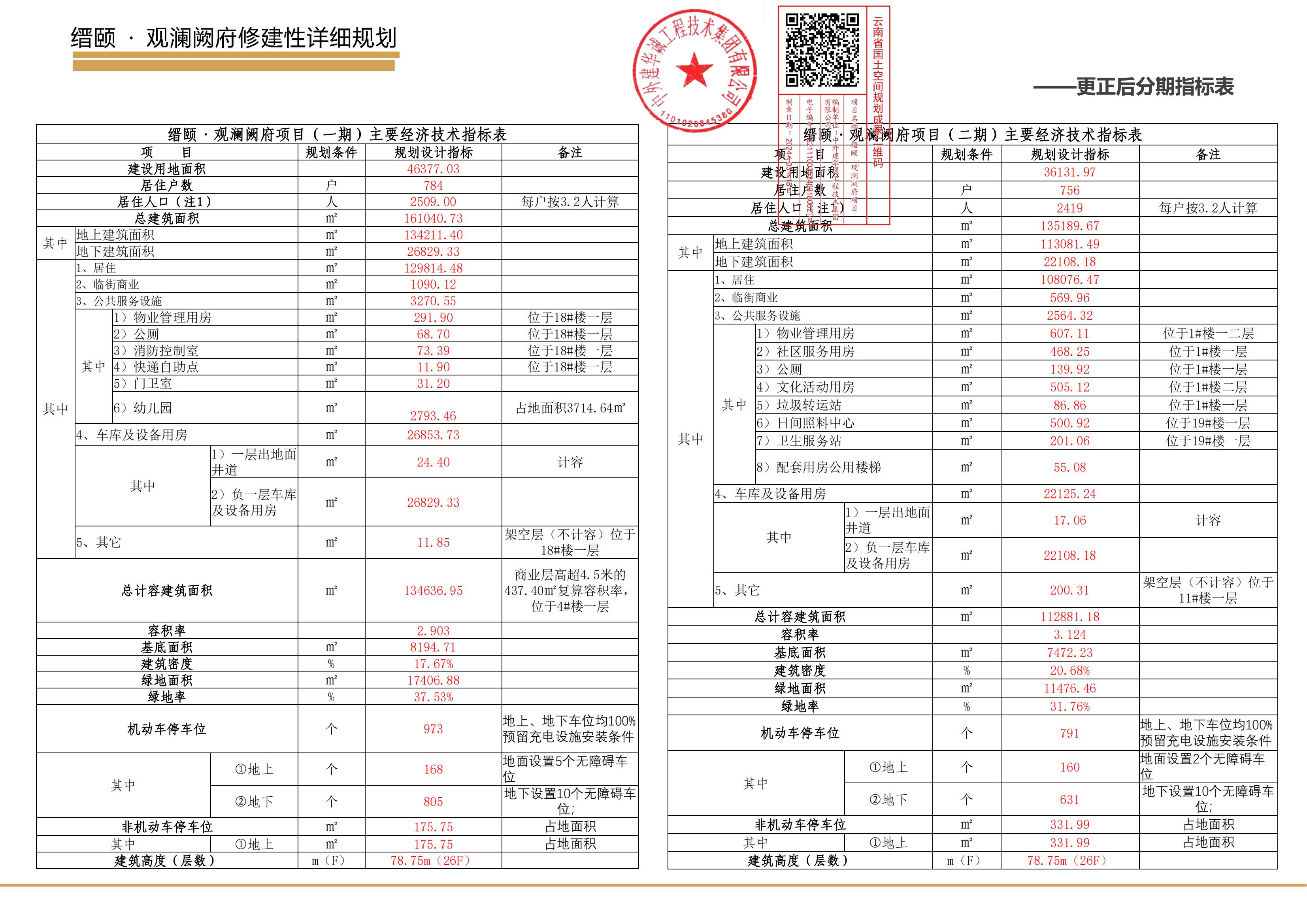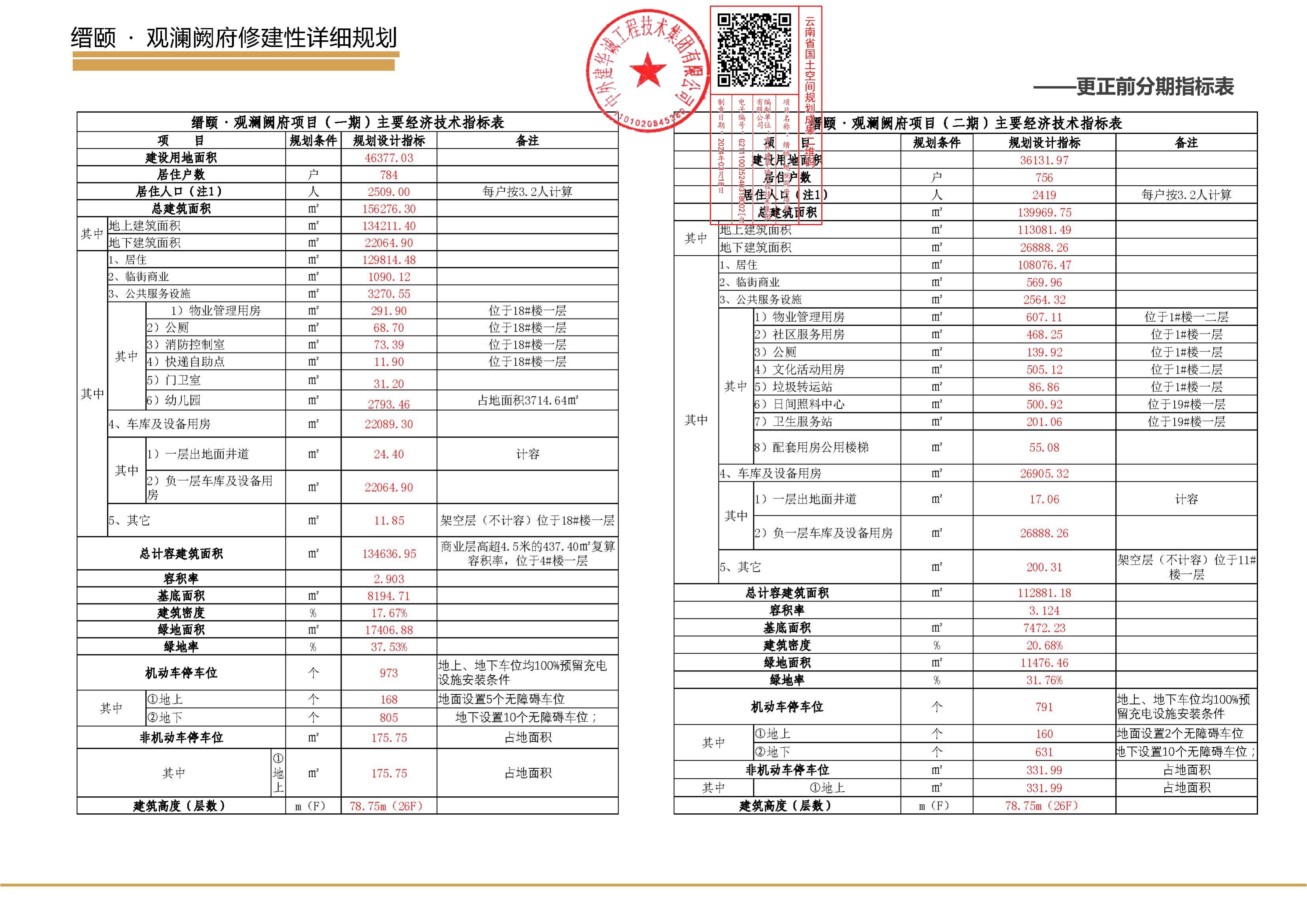 缙颐·观澜阙府修建性详细规划变更前后分期经济技术指标对比表