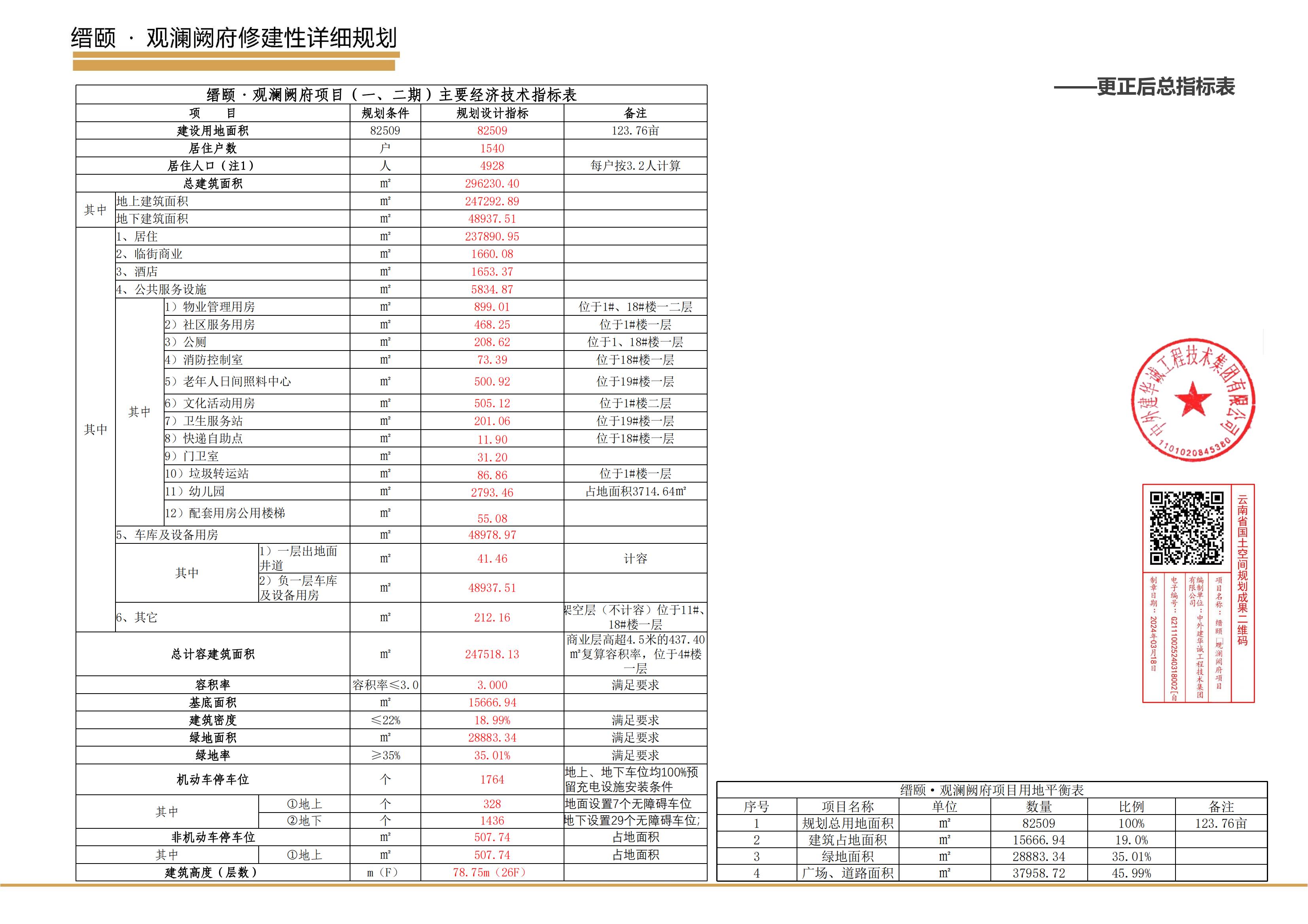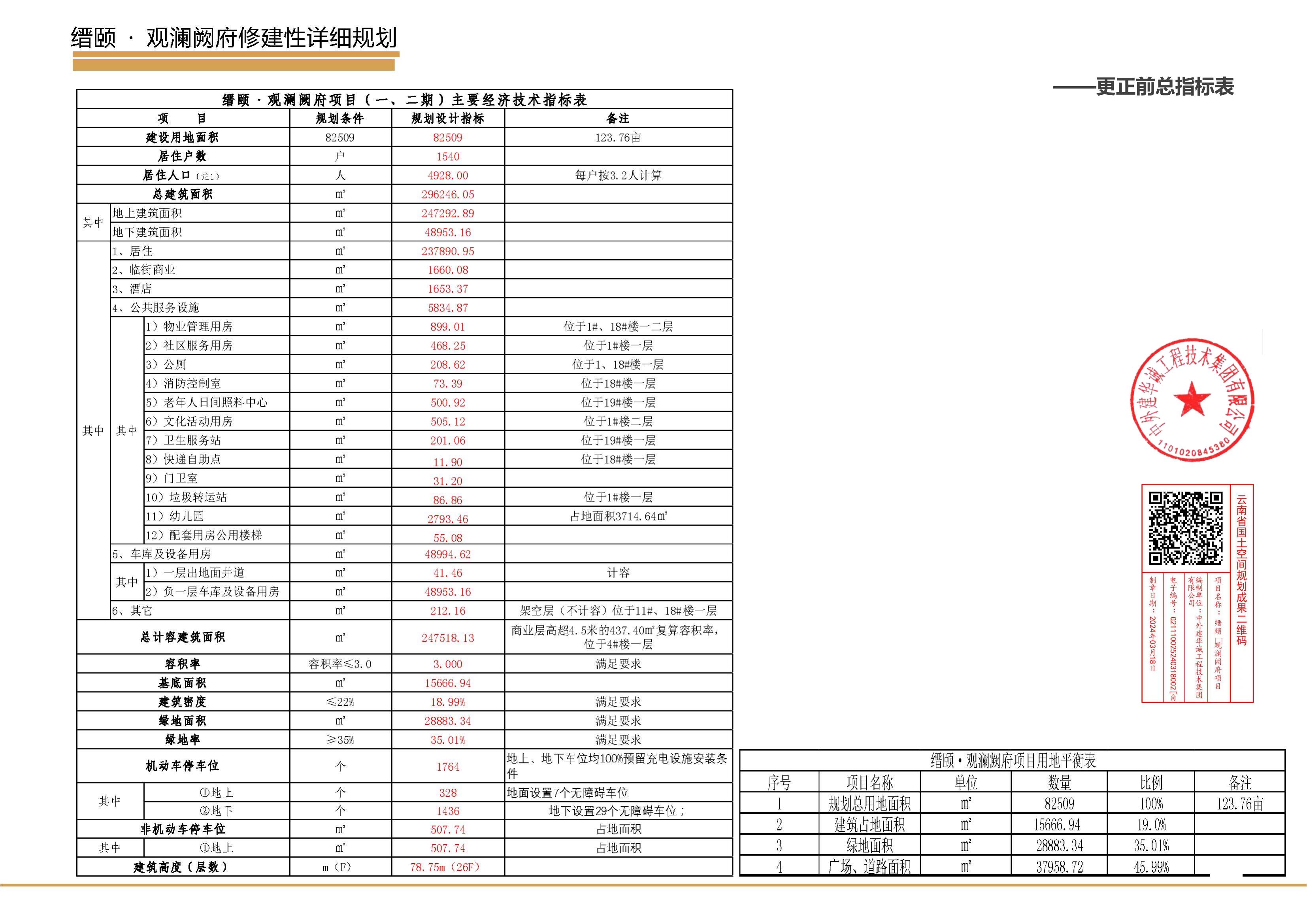 缙颐·观澜阙府修建性详细规划变更前后总体经济技术指标对比表