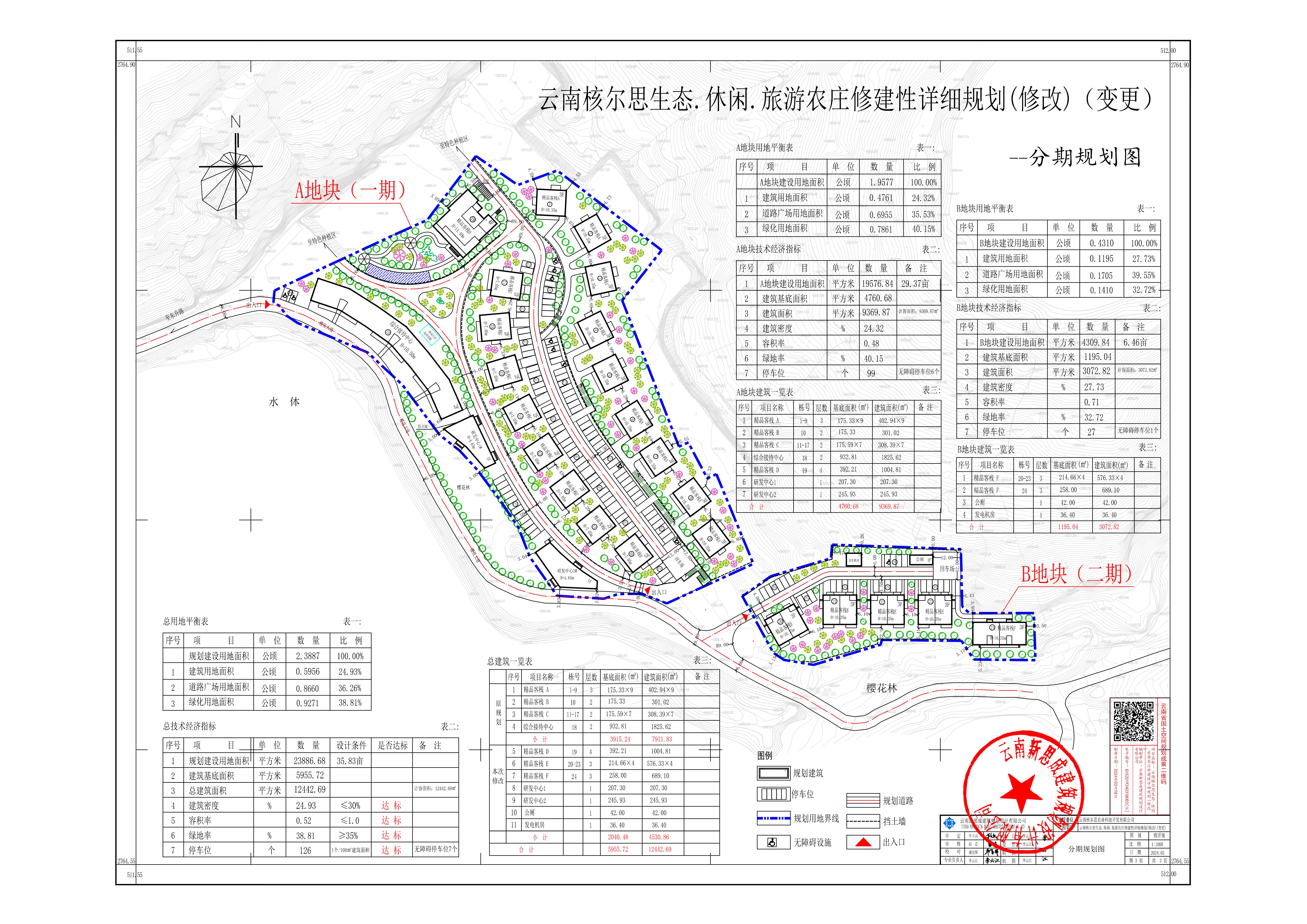 项目简介:云南核尔思生态.休闲.旅游农庄项目用地位于楚雄市东南部鹿城镇富民村委会,西临土窝坡水库,东、南、北临现状山体,规划用地面积35.83亩(A地块29.37亩,B地块6.46亩)。该项目修建性详细规划(修改)于2020年8月审定实施。现云南核尔思农业科技开发有限公司提出,在该项目整体布局、总体经济技术指标、工程管线、竖向规划等均保持不变的前提下,将项目分为两期实施建设,A地块为一期,B地块为二期。