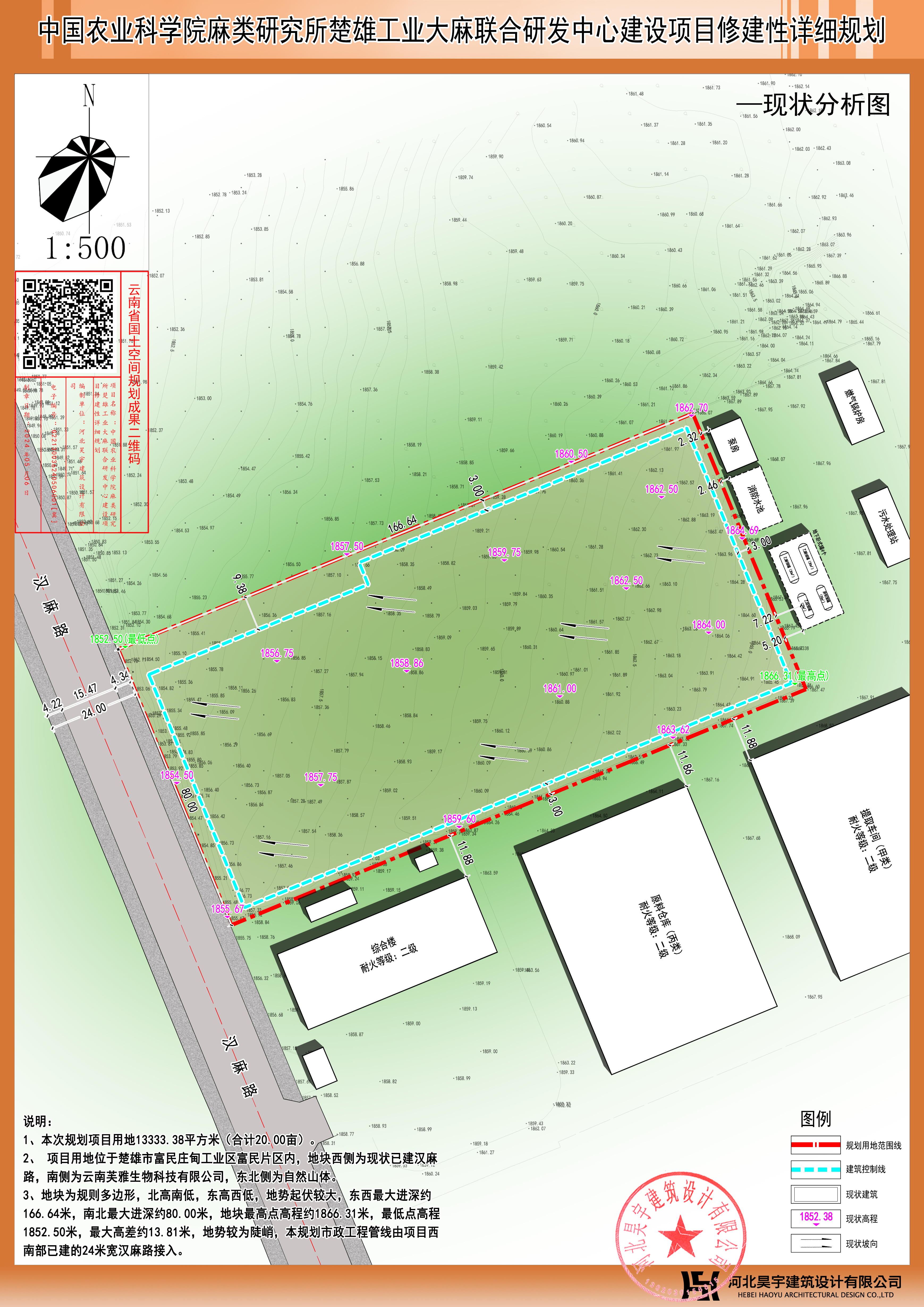 项目简介:中国农业科学院麻类研究所楚雄工业大麻联合研发中心建设项目用地位于楚雄工业园富民庄甸工业富民片区工业大麻园区,地块东、南临湖南方盛制药股份有限公司工业大麻加工基地项目用地,西临汉麻路,北临现状山体,规划用地面积20亩。通过规划拟建楚雄工业大麻研发中心,规划分为两期实施建设。