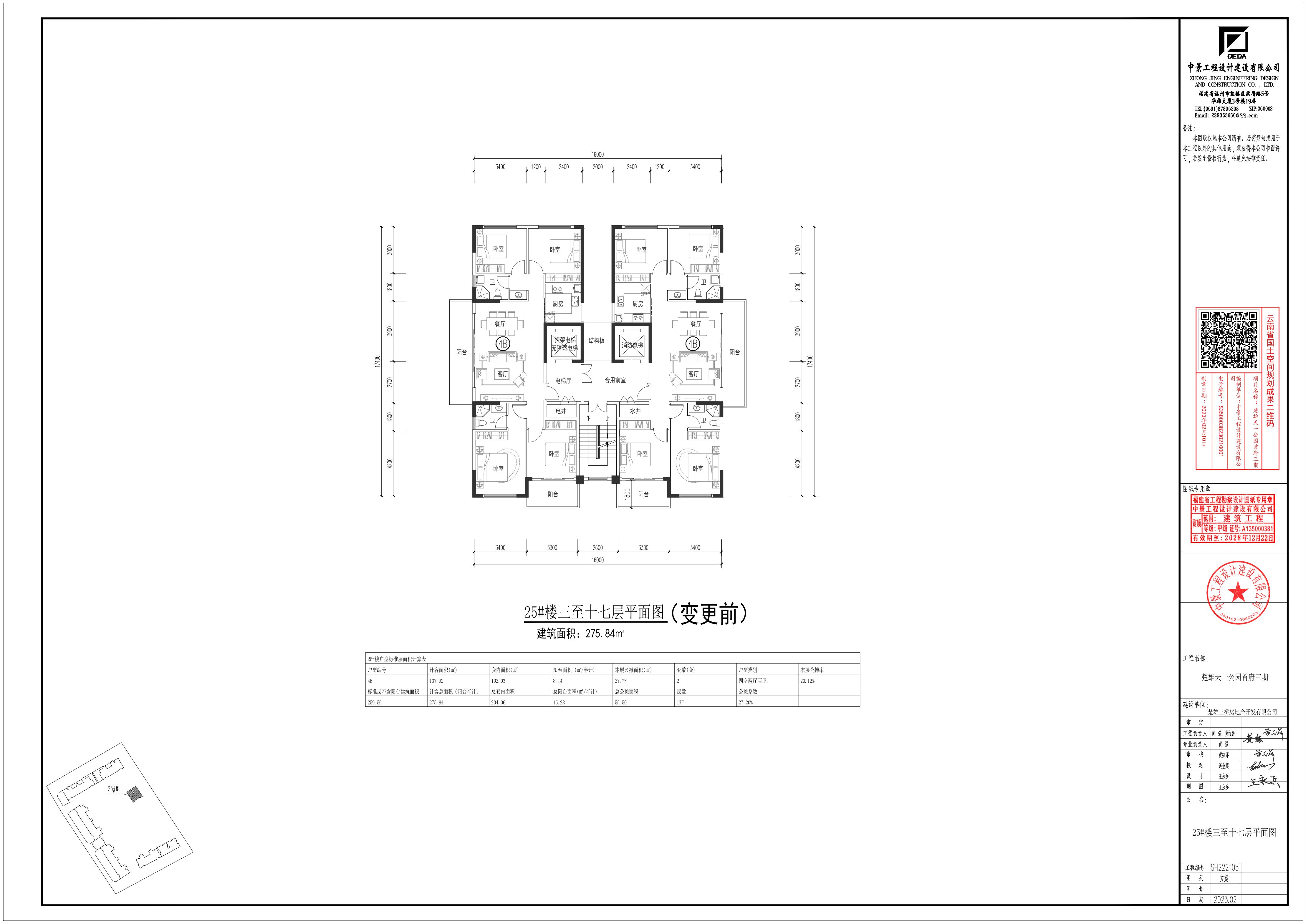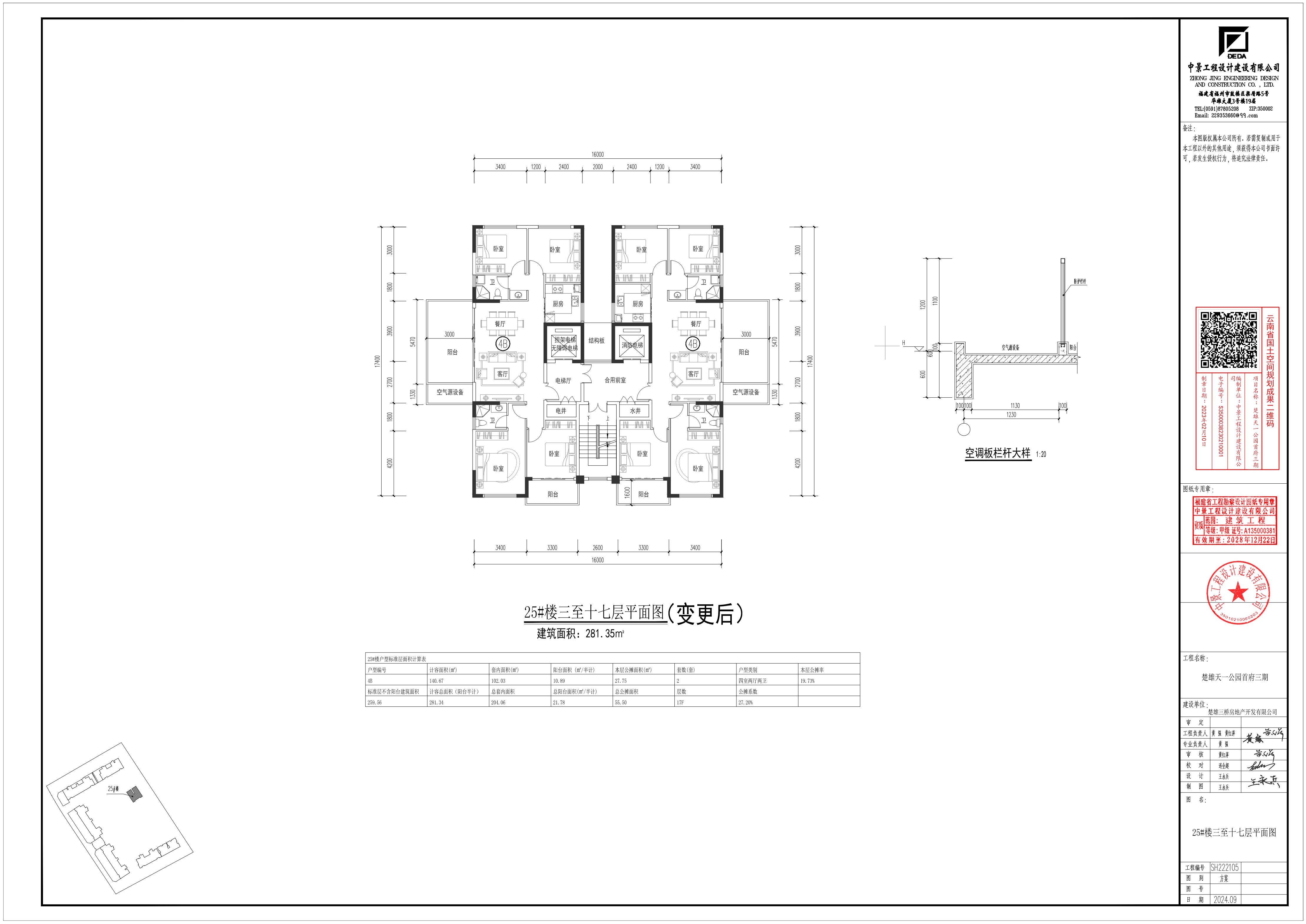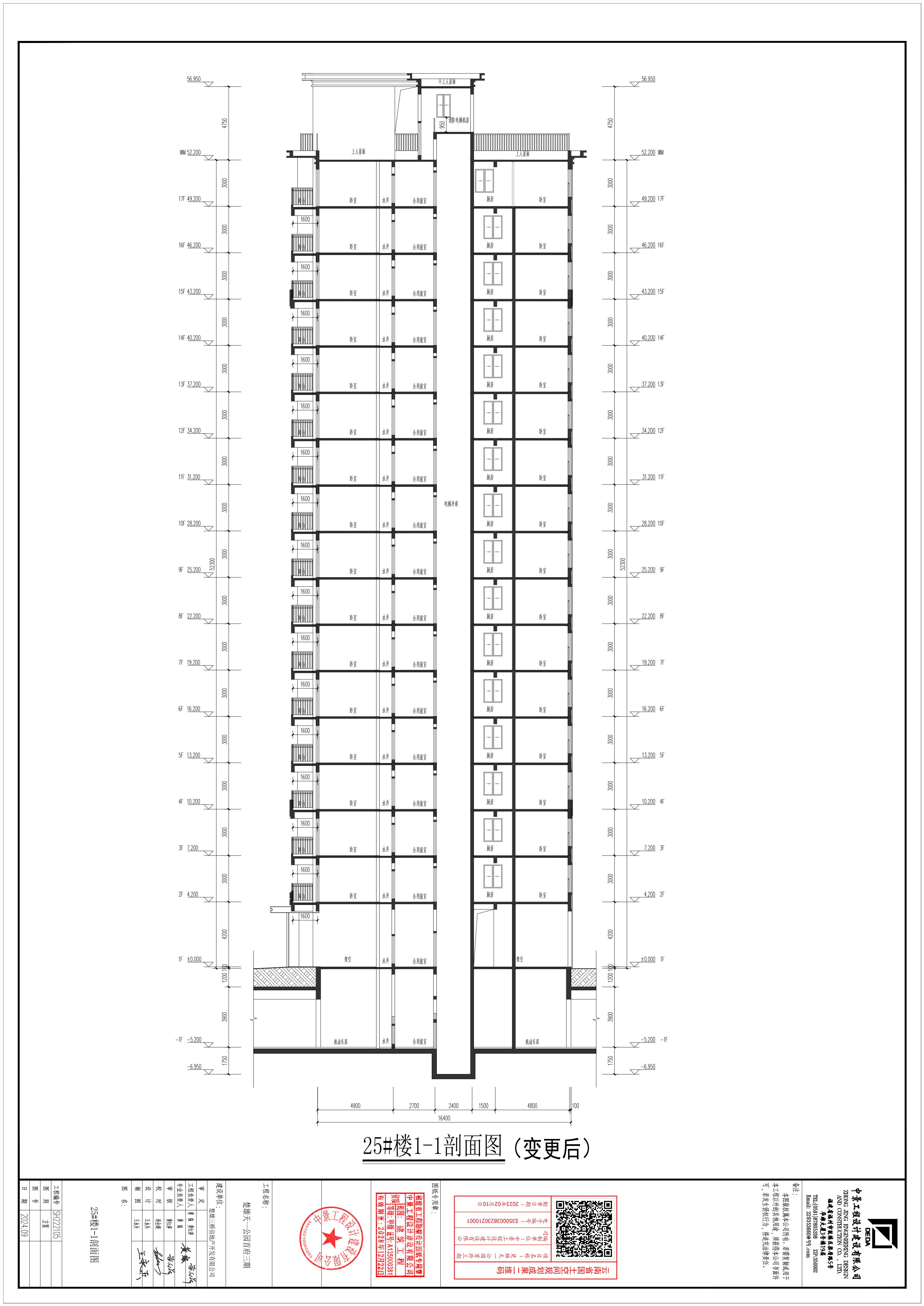 四、根据上述调整,25#楼指标变化情况如下:基底面积保持不变;一层建筑面积、计容建筑面积保持不变;二至十七层各层建筑面积由275.84㎡调整为281.35㎡,增加5.51㎡,计容建筑面积由275.84㎡调整为281.35㎡,增加5.51㎡;屋顶层建筑面积由33.28㎡调整为44.24㎡,增加10.96㎡;计容建筑面积由33.28㎡调整为44.24㎡,增加10.96㎡;总建筑面积由4738.42㎡调整为4837.54㎡,增加99.12㎡;计容建筑面积由4499.10㎡调整为4598.22㎡,增加99.12㎡。