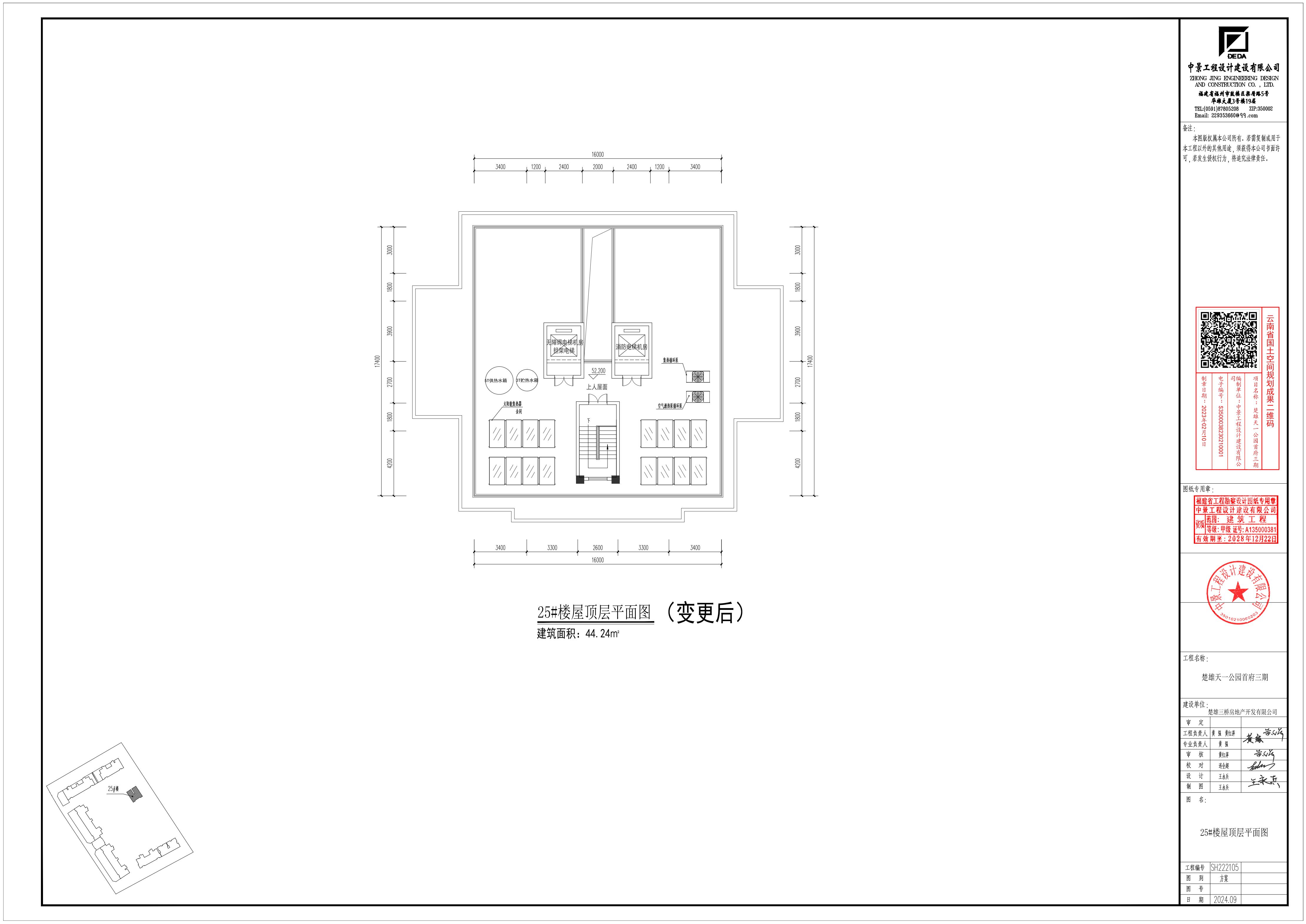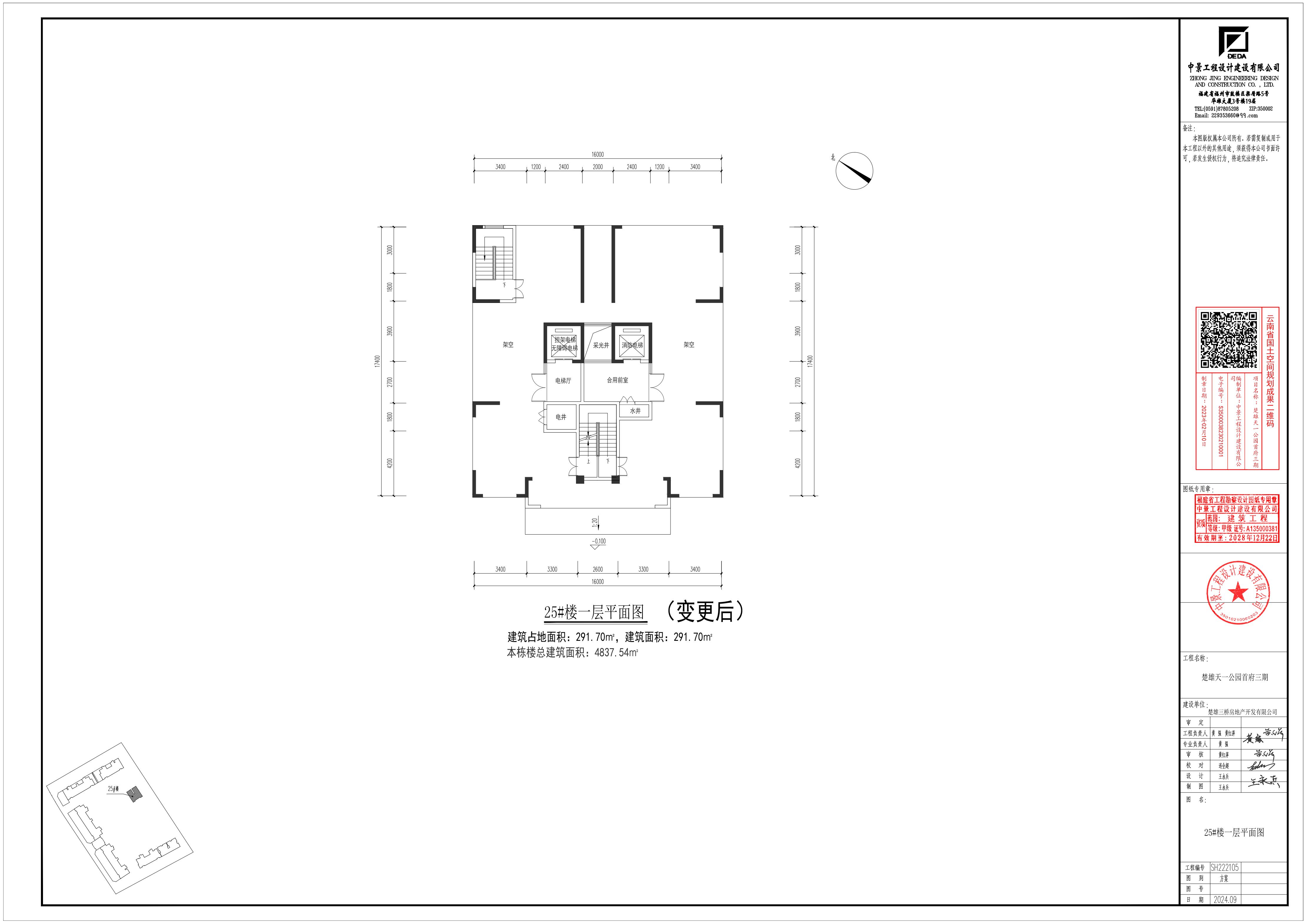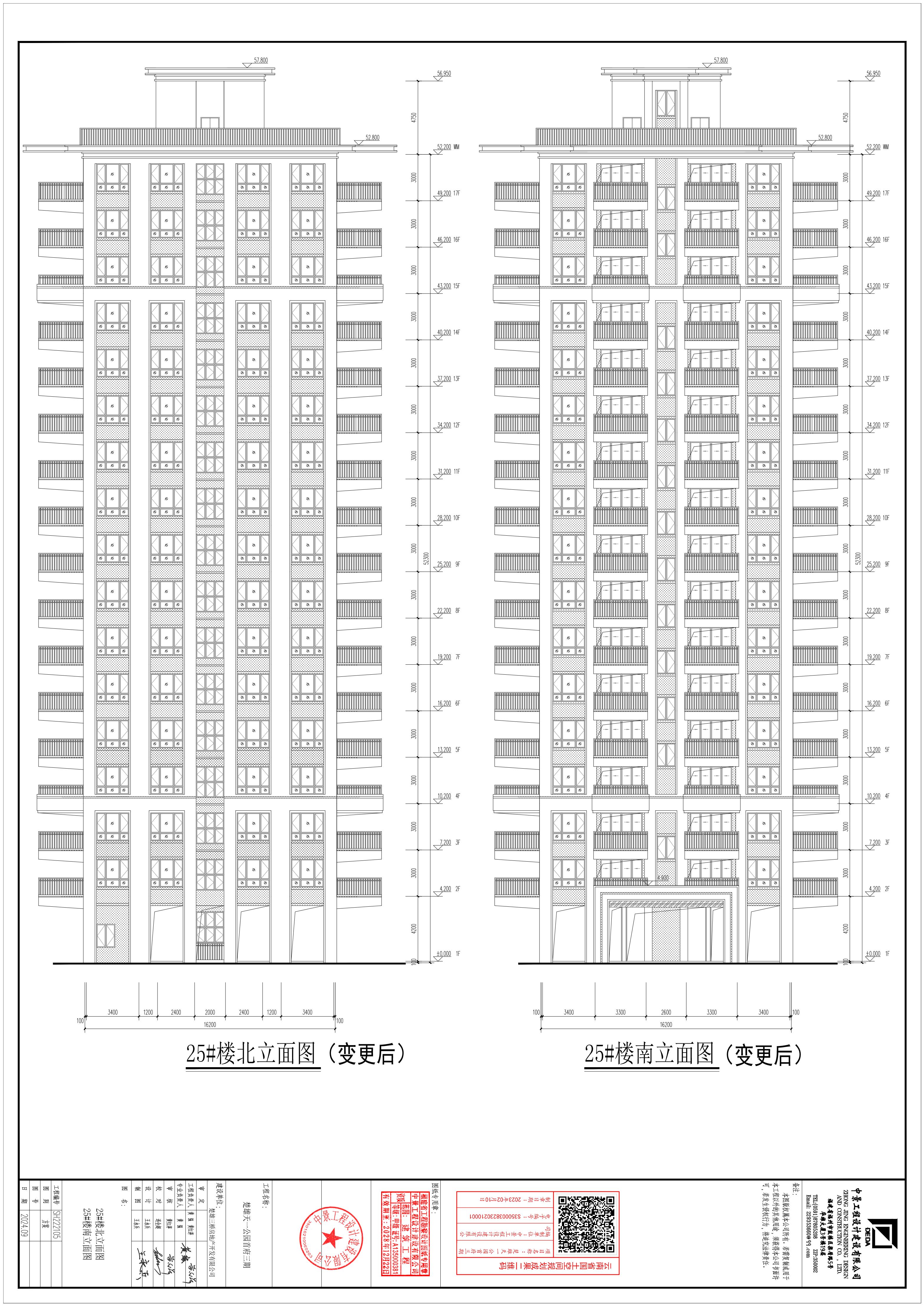 四、根据上述调整,25#楼指标变化情况如下:基底面积保持不变;一层建筑面积、计容建筑面积保持不变;二至十七层各层建筑面积由275.84㎡调整为281.35㎡,增加5.51㎡,计容建筑面积由275.84㎡调整为281.35㎡,增加5.51㎡;屋顶层建筑面积由33.28㎡调整为44.24㎡,增加10.96㎡;计容建筑面积由33.28㎡调整为44.24㎡,增加10.96㎡;总建筑面积由4738.42㎡调整为4837.54㎡,增加99.12㎡;计容建筑面积由4499.10㎡调整为4598.22㎡,增加99.12㎡。