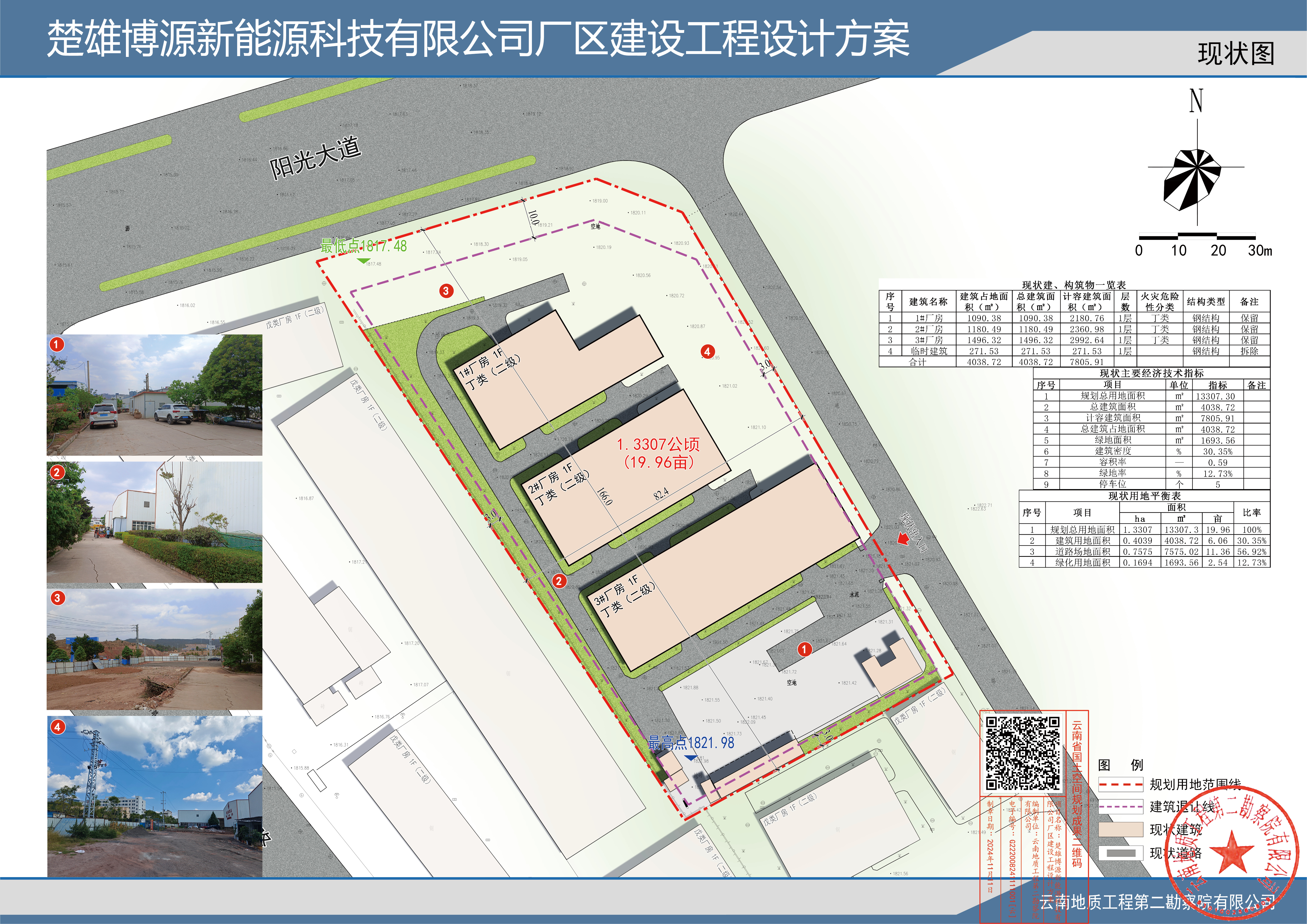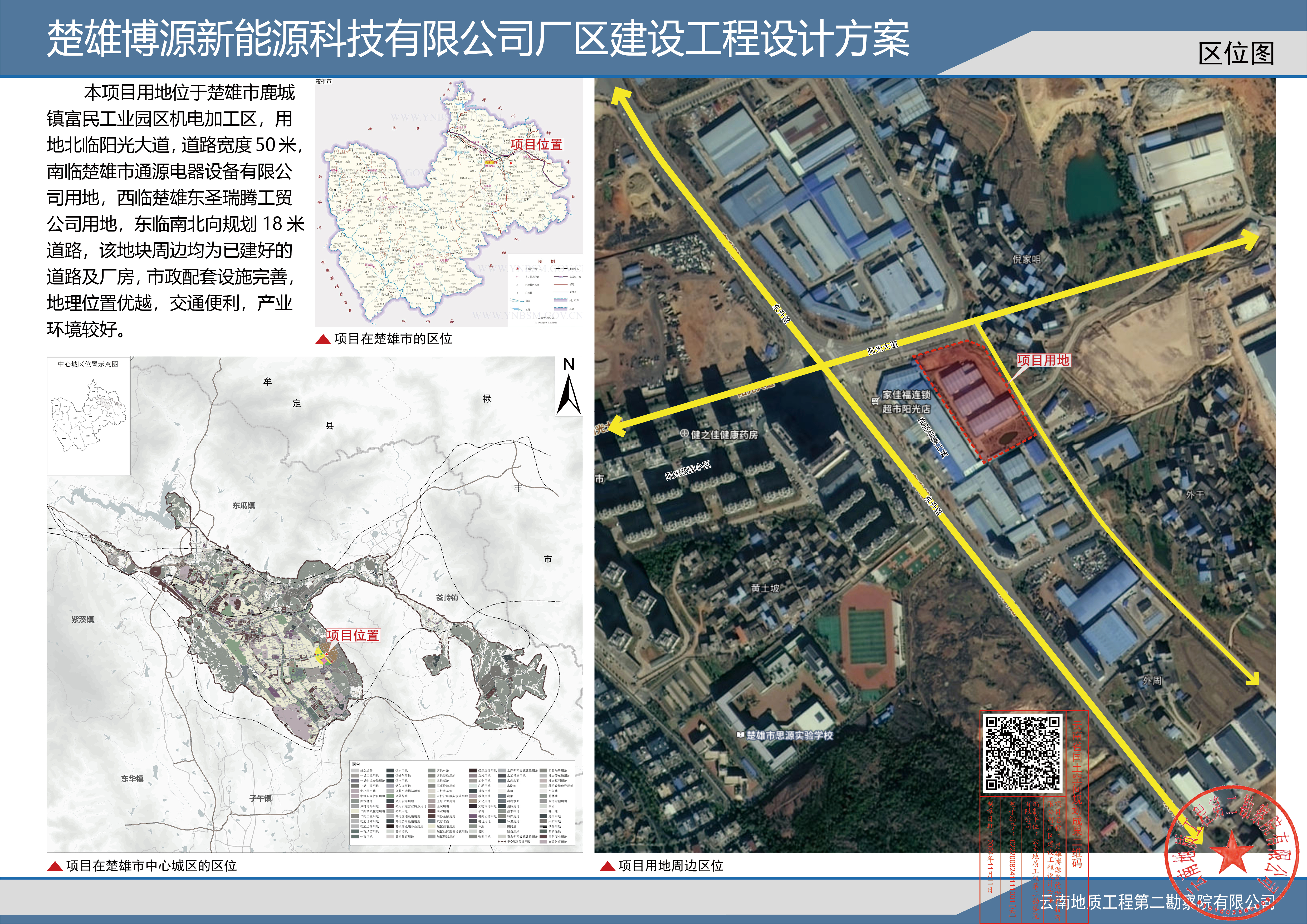 项目简介:楚雄博源新能源科技有限公司厂区建设项目用地位于楚雄工业园富民庄甸工业区富民片区,地块东临规划道路,南临通源电气设备有限公司用地,西临楚雄东圣瑞腾工贸公司用地,北临阳光大道,规划用地面积约19.96亩。现为满足发展需求,楚雄博源新能源科技有限公司提出在保持已建部分不变,且经济技术指标满足相关规范要求的前提下,对厂区规划进行优化调整。