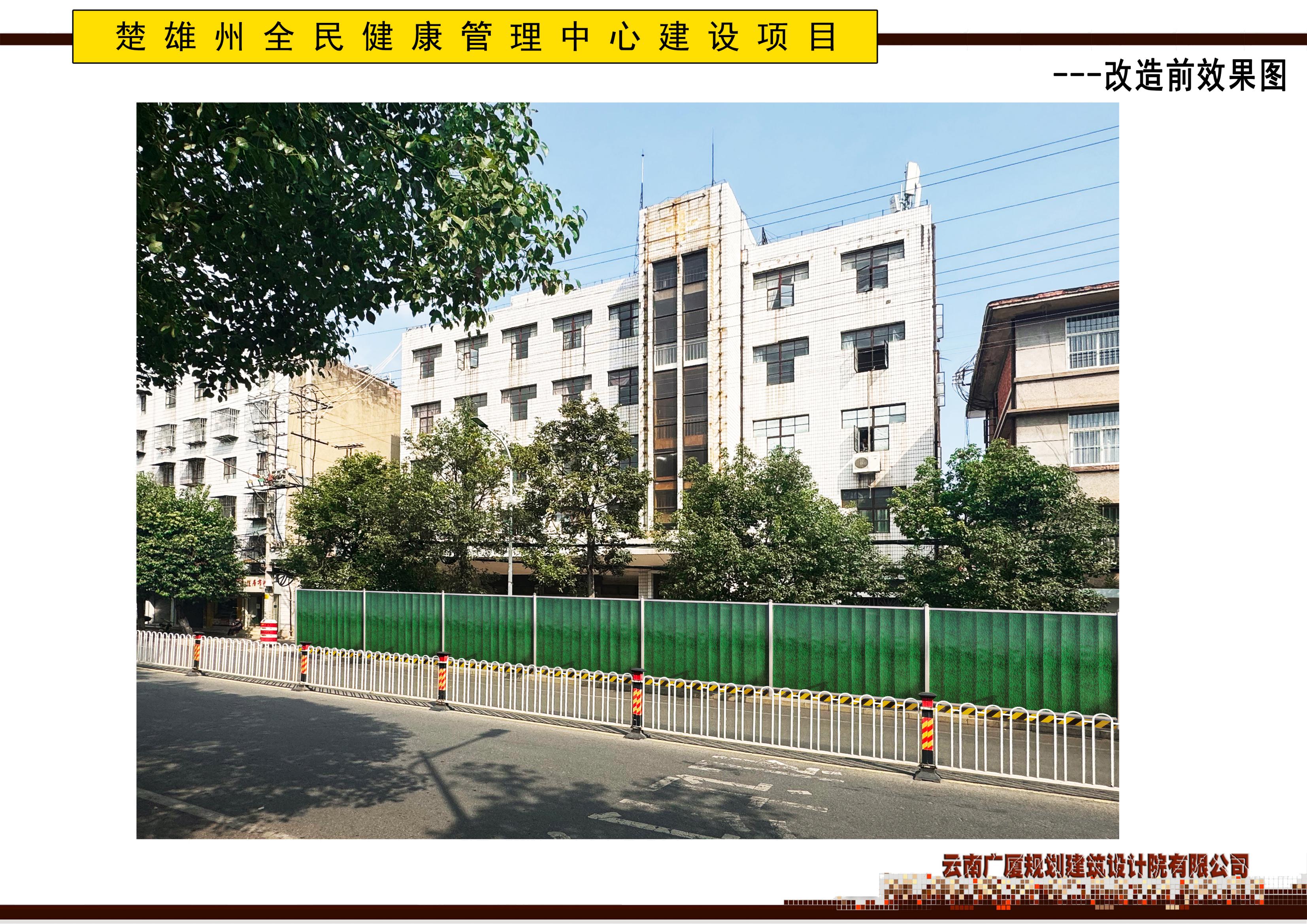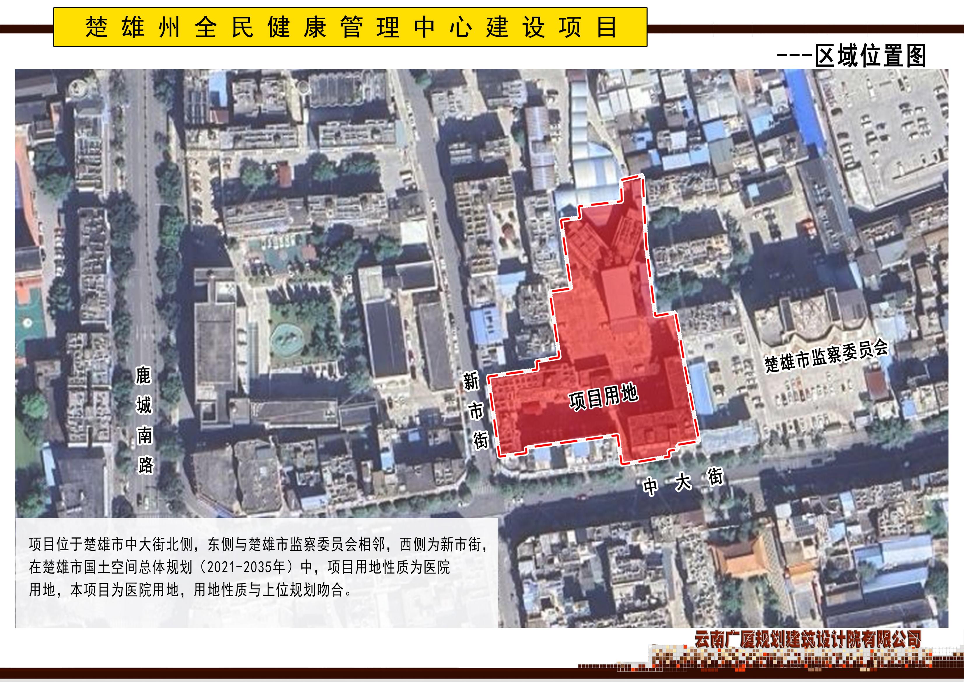 项目简介:楚雄州全民健康管理中心建设项目用地位于楚雄市楚雄市老城区中部,东临市纪委监委、林草局等部门用地,南临中大街,西临新市街,北临现状建筑,总用地面积约8.34亩。该项目原为楚雄市人民医院院区及职工宿舍及其配套设施,现拟将临中大街一侧的门诊楼提升改造为全民健康管理中心,主要规划内容为: