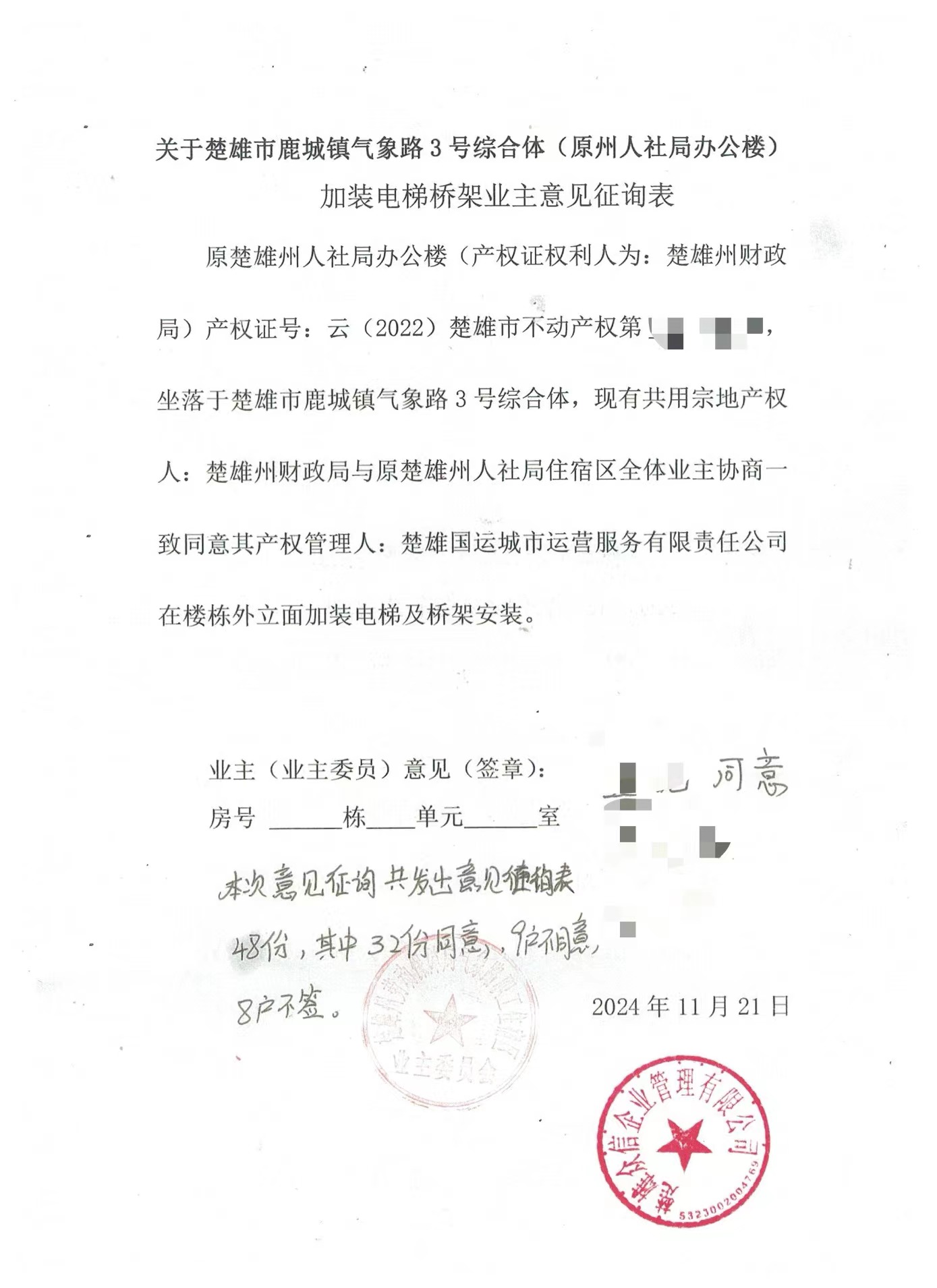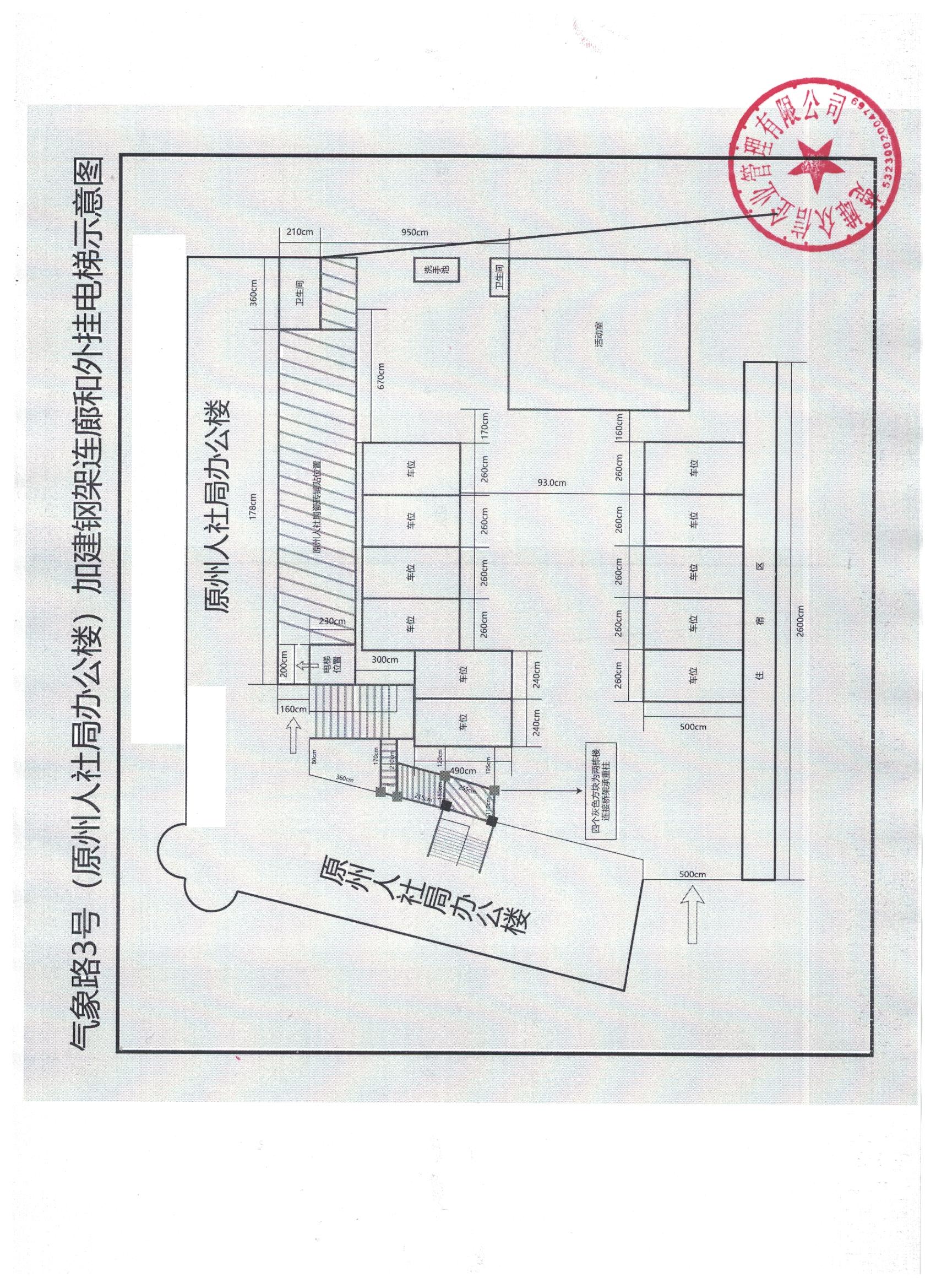 项目简介:楚雄州人社局住宿小区原办公楼位于楚雄市老城区,用地东临气象路,南临东兴路,西临邱家巷临时商业建筑,北临邱家巷,土地使用面积2723.1㎡,与住宅小区共用宗地、共用出入口和通道。现拟在用地范围内新增设一部外挂电梯和钢架走廊供原办公建筑使用。增设走廊和电梯的方案于2024年11月28日至12月4日在小区公示栏进行了公告,并征得小区业主委员会的同意,按照相关程序,现将增设电梯和走廊的方案进行公示。