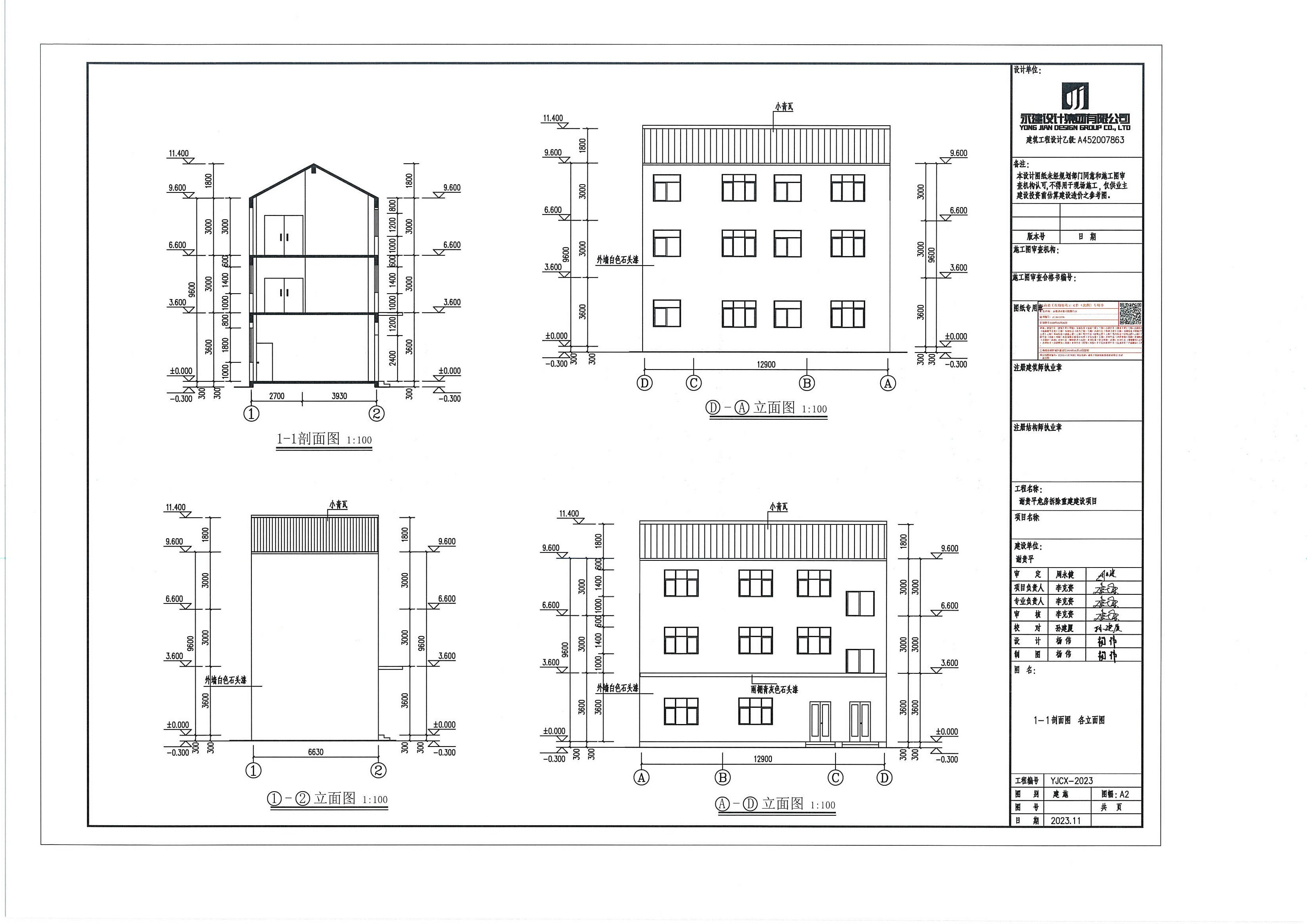 2、谢贵平自建房设计方案立面图及剖面图。