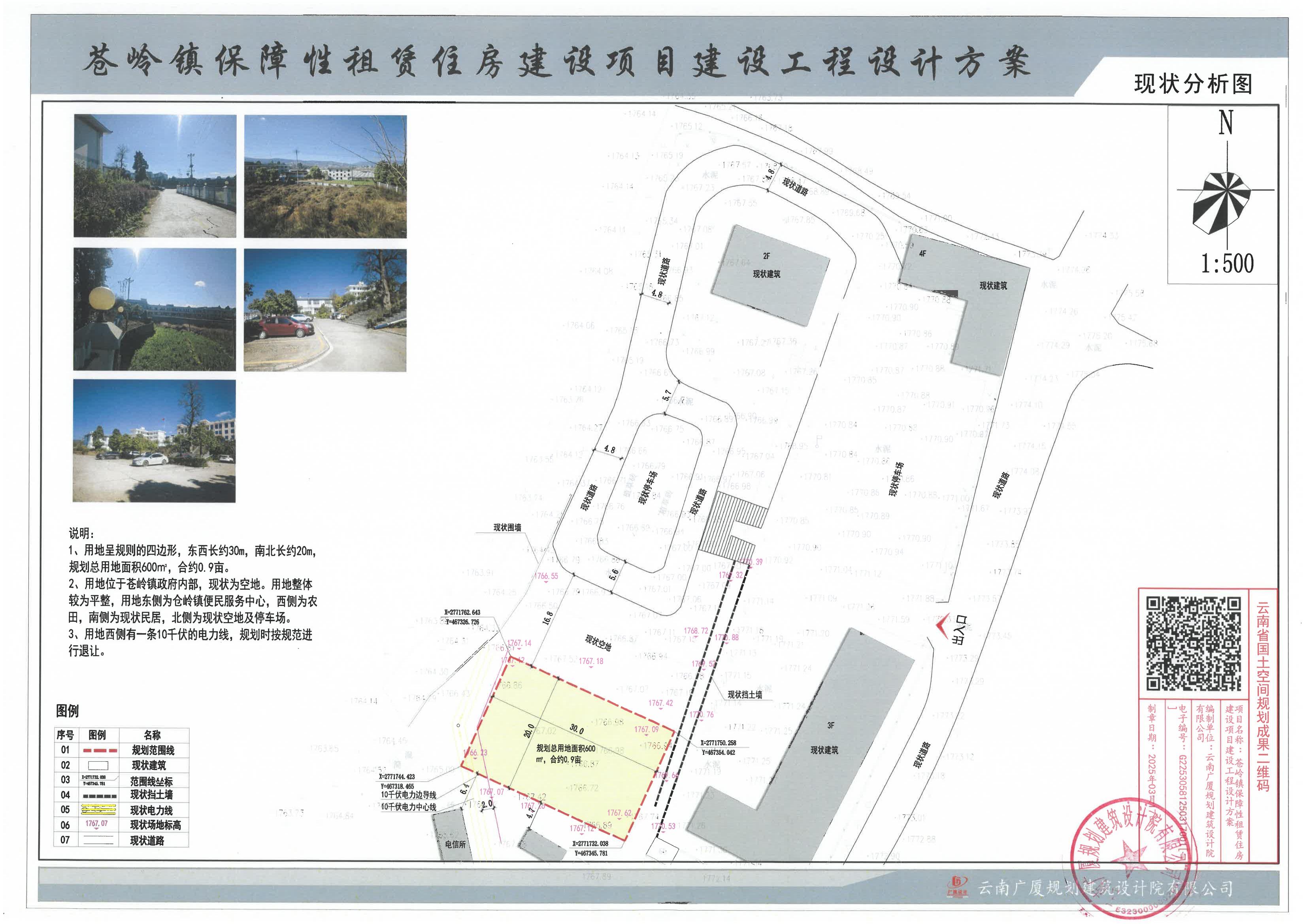项目简介:苍岭镇保障性租赁住房建设项目用地位于楚雄市苍岭镇,地块东临苍岭镇政府便民服务中心,西临现状农田,南临现状民房,北临苍岭镇人民政府停车场,规划用地面积约0.9亩。通过规划拟新建一栋保障性住房及配套设施。