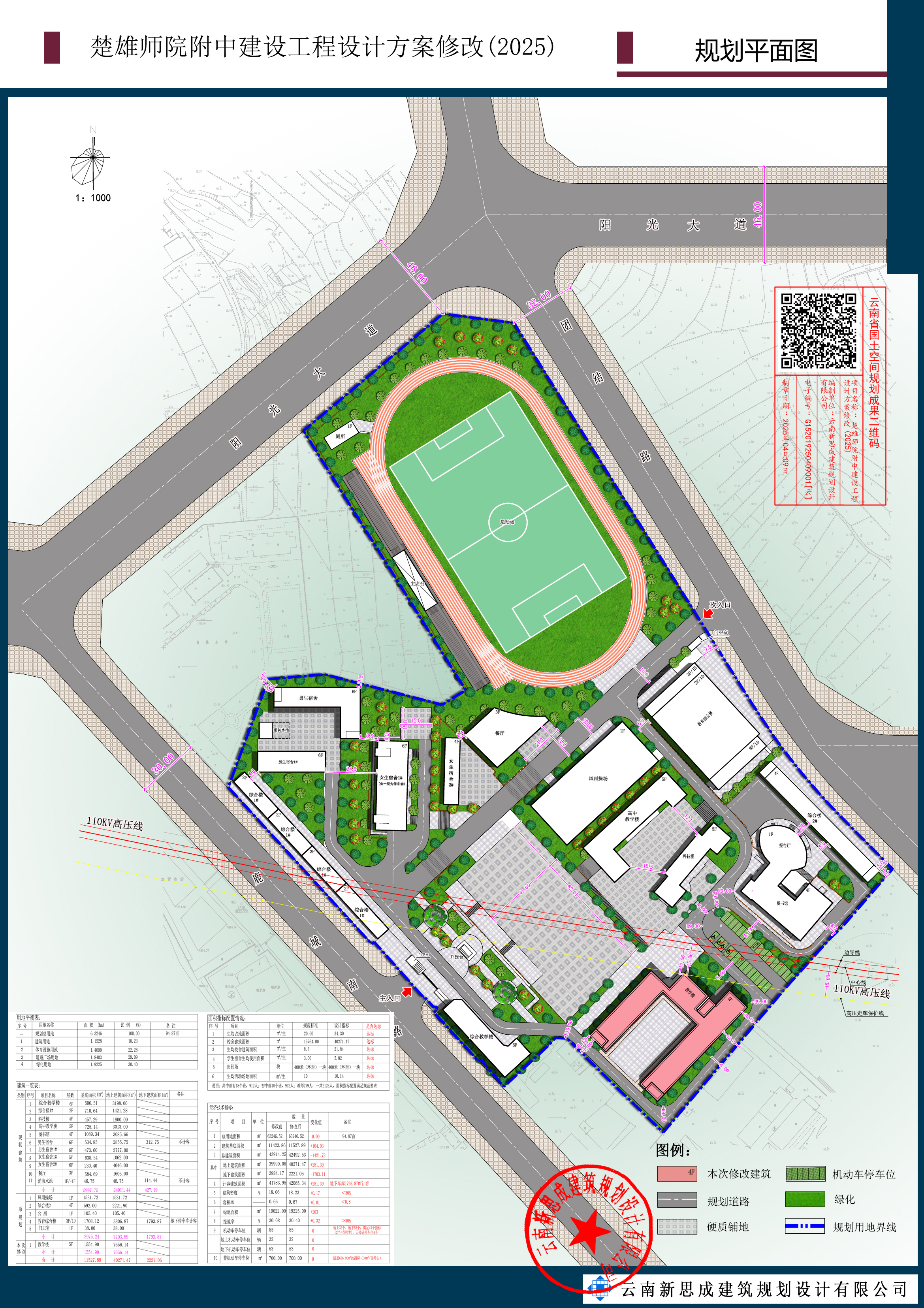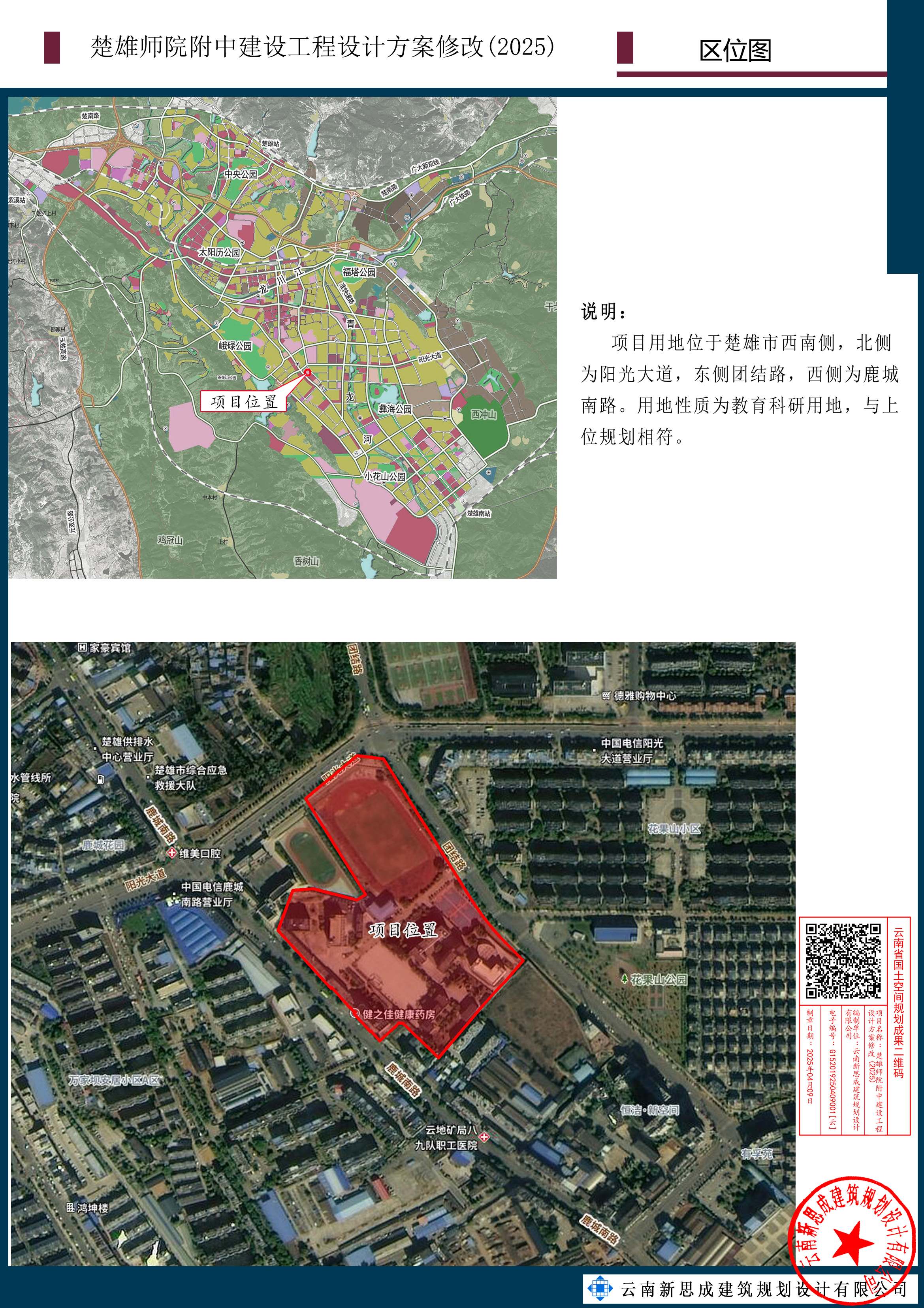 项目简介:楚雄师院附中项目用地位于楚雄市中心城区中南部,地块东临团结路,南临现状居住小区,西临鹿城南路,北临北城小学南路校区,规划用地面积94.87亩,该项目修建性详细规划修改(2024)于2024年8月27日审定实施,现楚雄师范学院附属中学提出在保持整体规划布局基本不变,经济技术指标等满足相关规范要求的前提下,对楚雄师院附中修建性详细规划修改(2024)进行修改,修改的主要内容如下:
