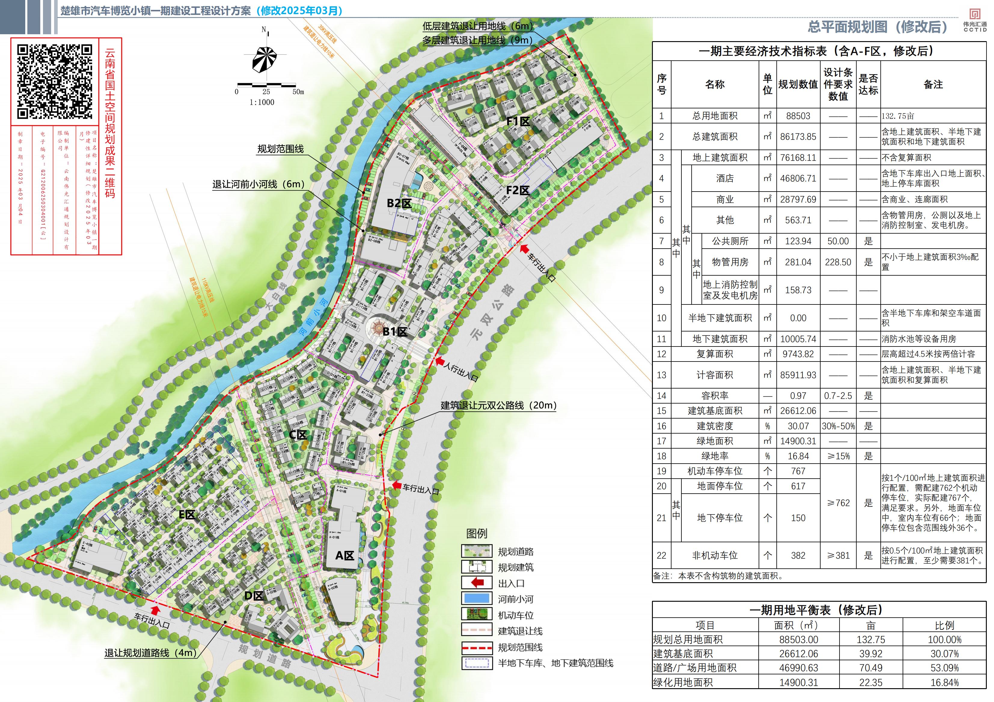 项目简介:楚雄市汽车博览小镇一期项目用地位于楚雄市西北部,地块东临元双公路,南临现状空地,西临河前小河,北临尚亿·紫溪壹号项目用地,规划用地面积132.75亩,该项目修建性详细规划于2021年6月审定实施,后进行了规划修改和变更,分为A、B1、B2、C、D、E、F区实施建设。现楚雄伟光汇通汽车博览产业发展有限公司提出在保持A-E区、F1区规划布局均不变,且F2区经济技术指标等满足规范要求的前提下,对楚雄市汽车博览小镇一期修建性详细规划(修改2024年5月)进行修改,修改的主要内容如下: