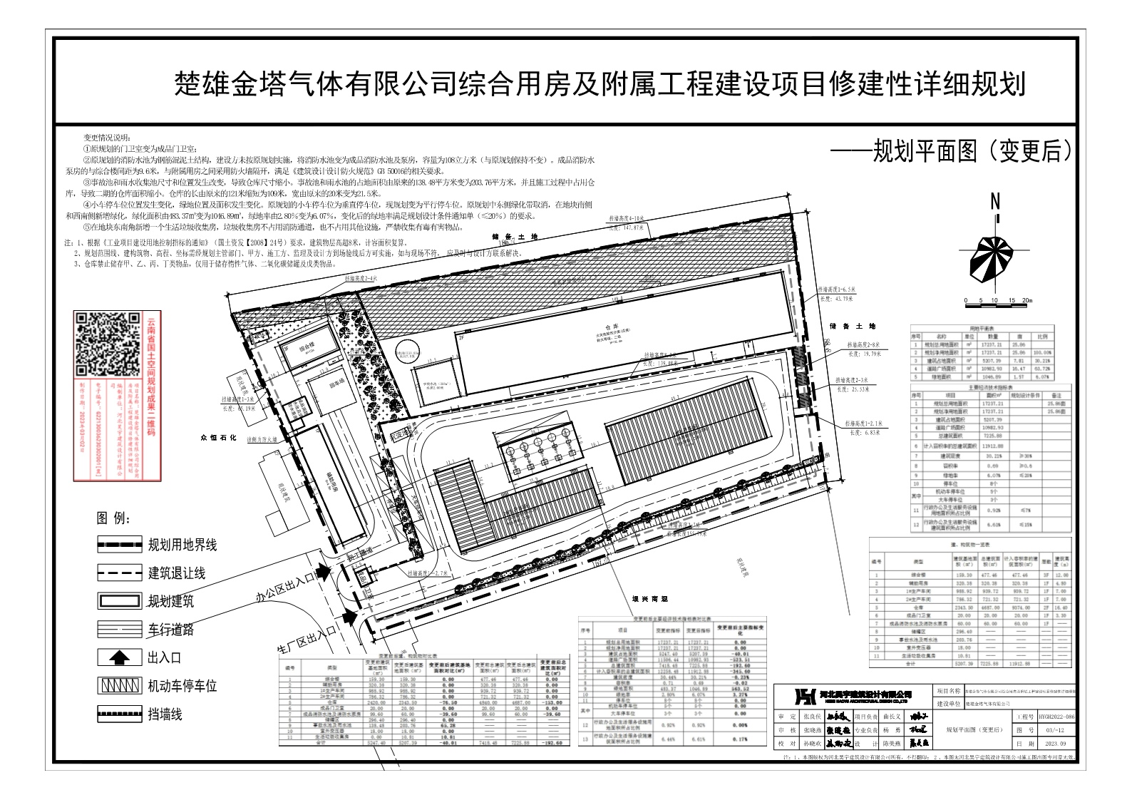 项目简介:楚雄金塔气体有限公司实施建设的“楚雄金塔气体有限公司综合用房及附属工程建设项目(一期)”位于楚雄市东南新城富民工业园区,该项目规划用地面积11207.89㎡,规划总建筑面积2538.88㎡,规划许可总建筑面积2578.48㎡,规划建筑占地面积2660.13㎡,规划计容面积2538.88㎡,规划容积率0.23,规划绿地率9.34%,规划建筑密度23.73%。项目建设单位根据审定规划于2023年4月6日办理了该项目编号为建字第楚雄市202300015号《建设工程规划许可证》。