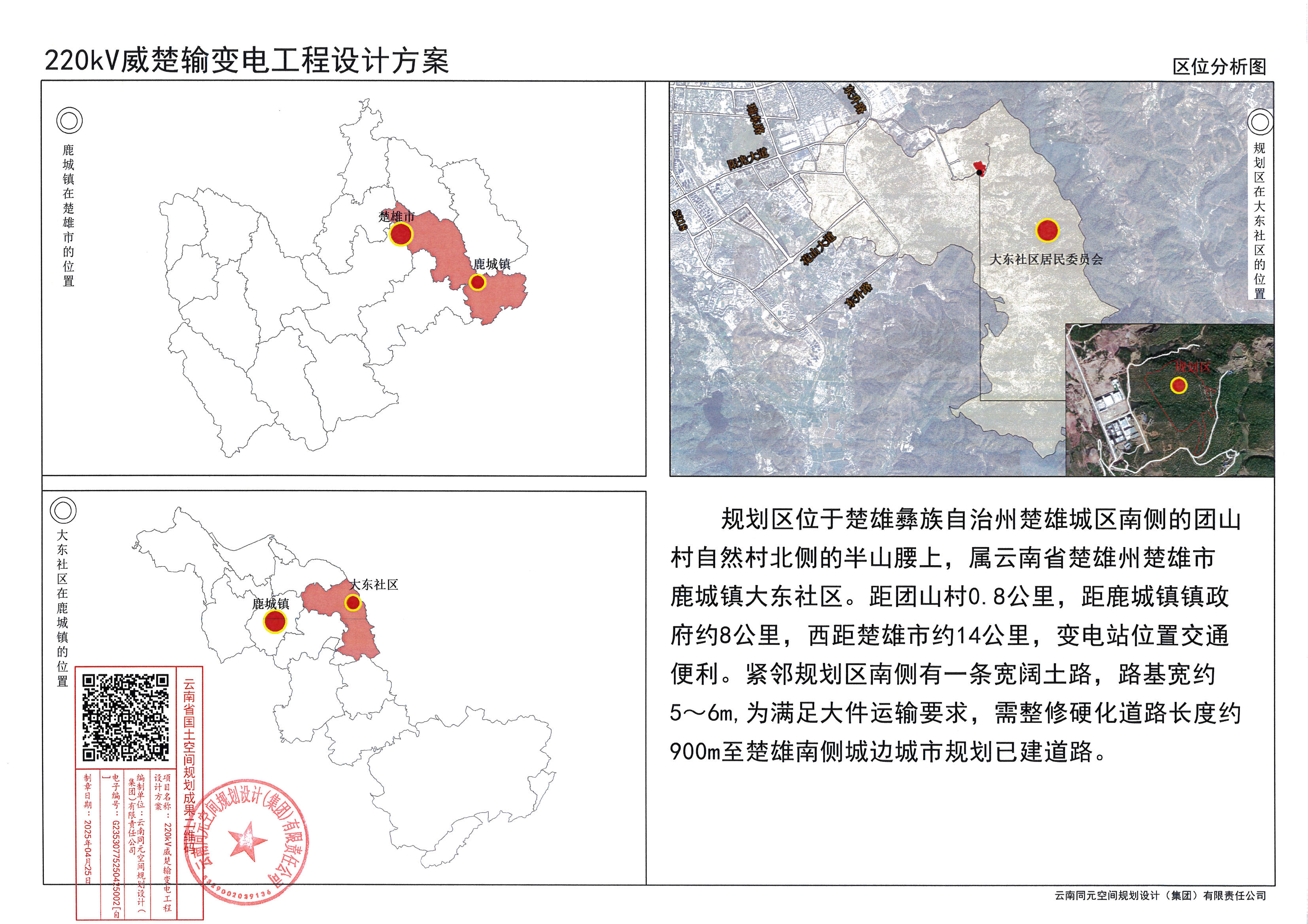 项目简介:220kV威楚输变电工程建设项目用地位于楚雄市彝海街道大东社区,用地南临农村道路,东、西、北三面临现状山林,规划用地面积44.19亩。通过规划拟新建配电装置类建筑及配套设施。