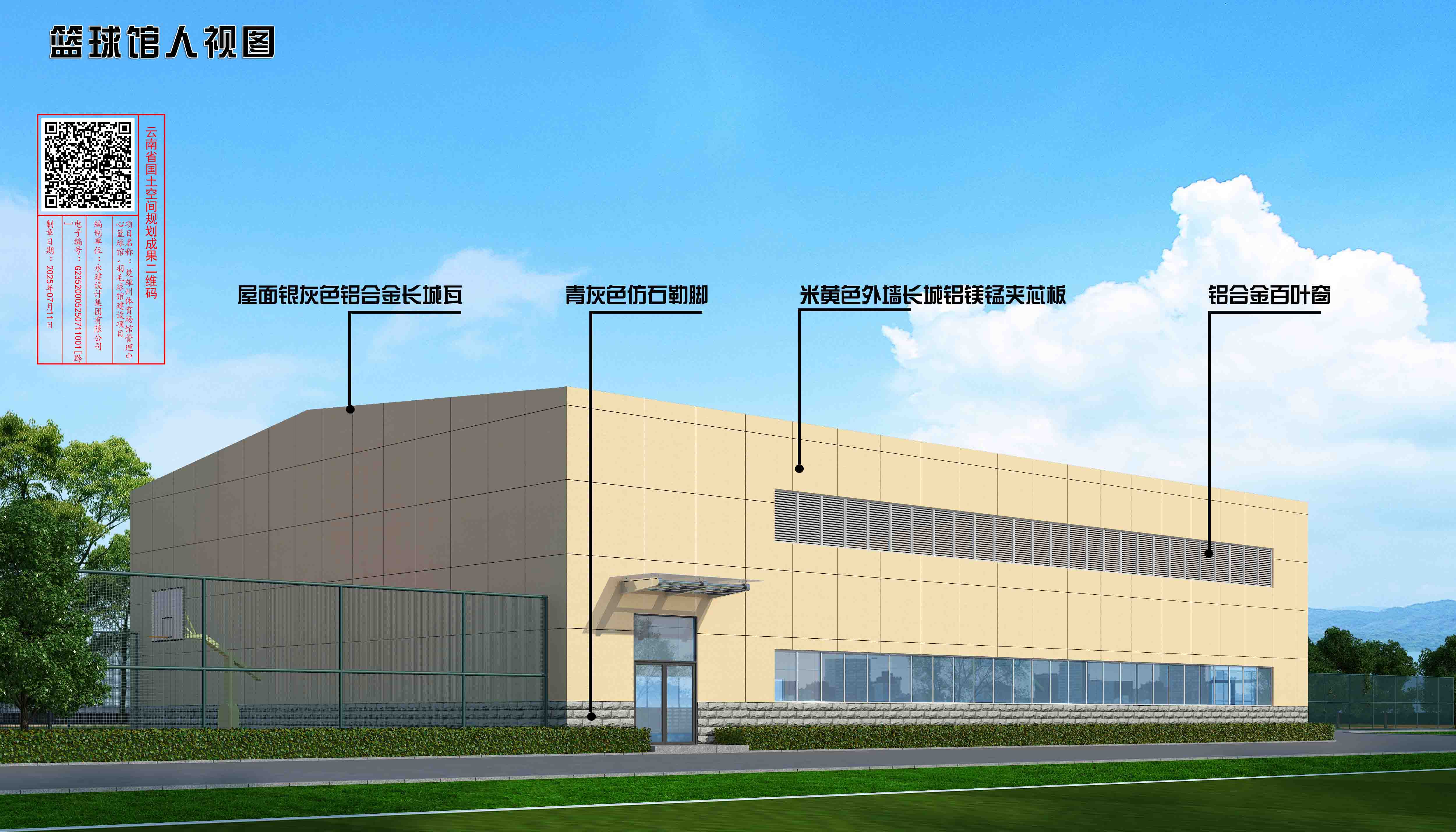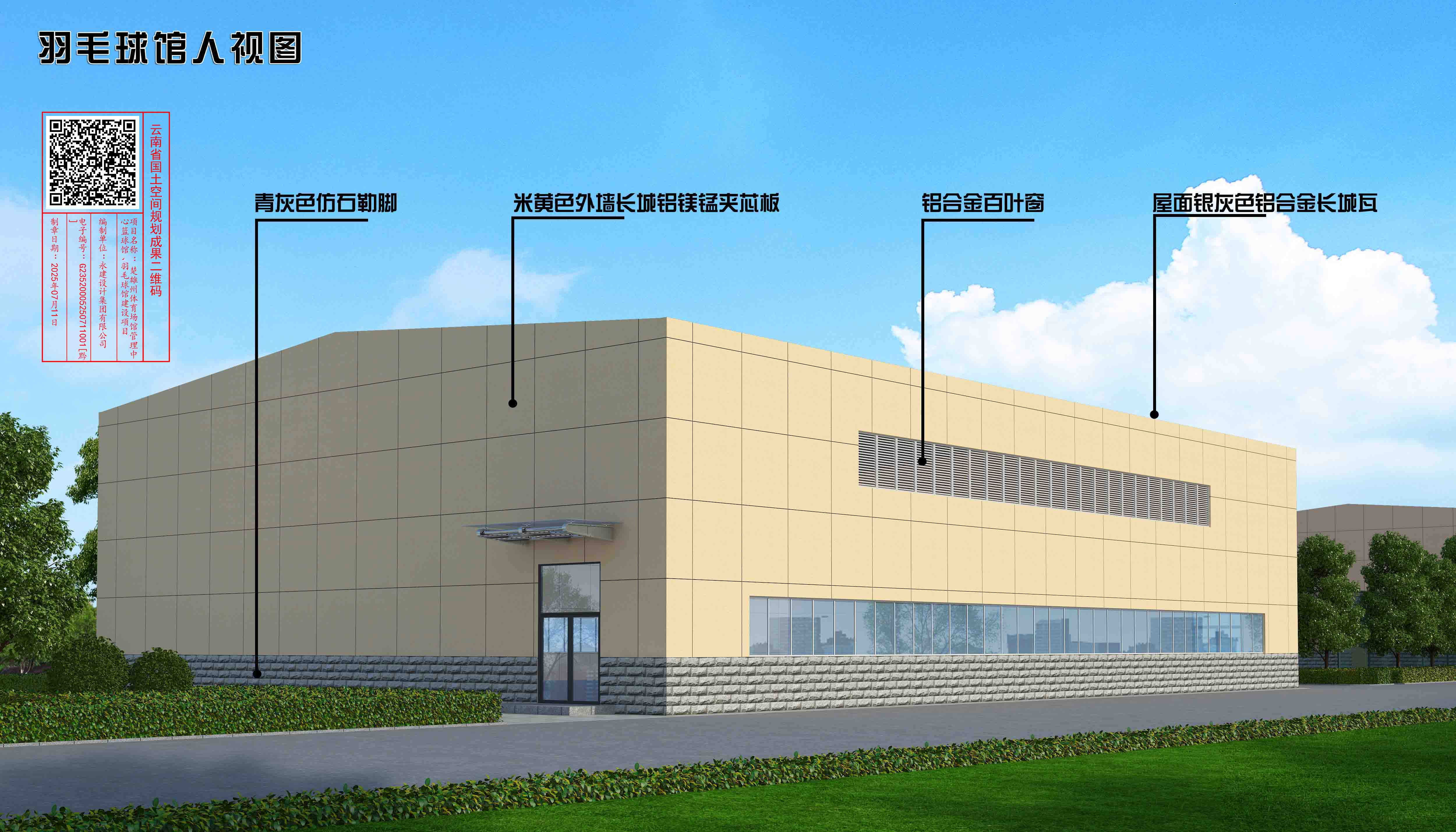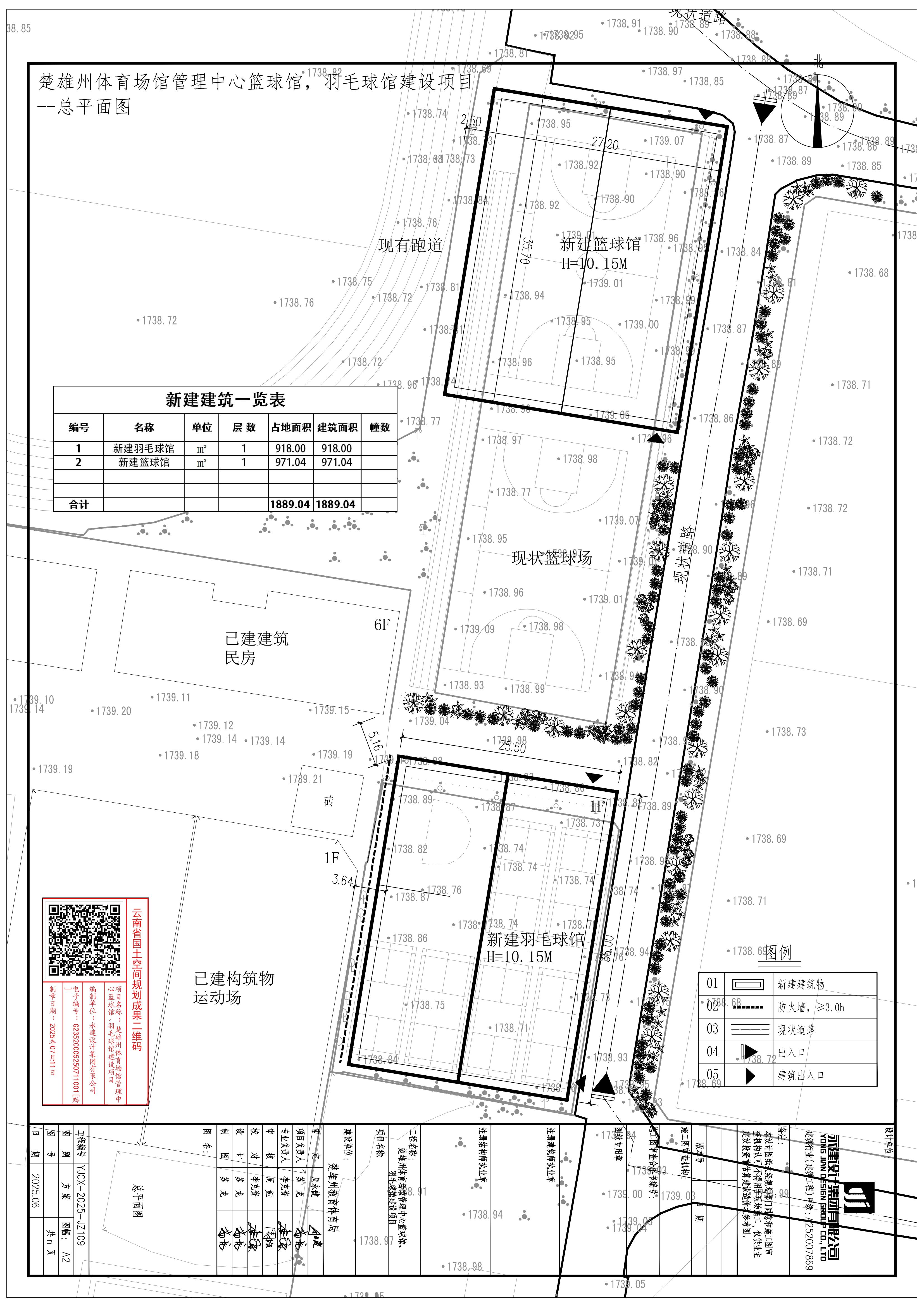 建筑占地面积:1889.04㎡,其中羽毛球馆918.00㎡、篮球馆971.04㎡。