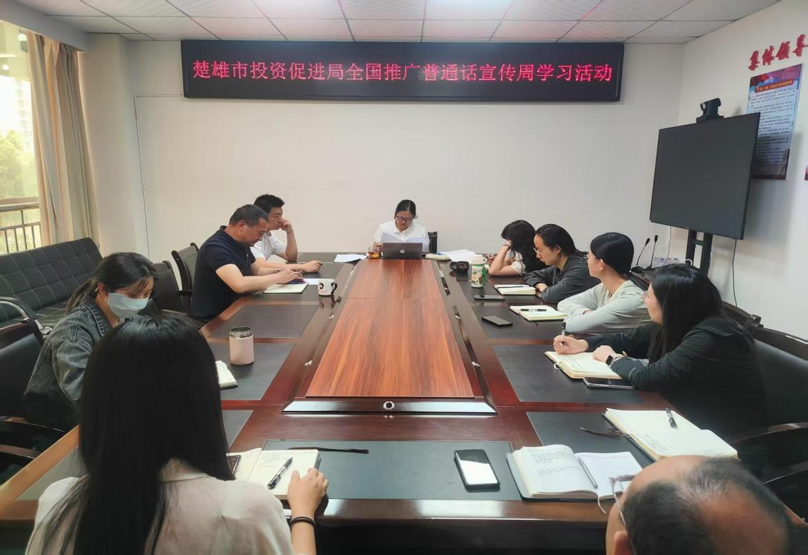 后续会议中开展了楚雄市投资促进局普通话宣传周学习活动,深入学习《国家通用语言文字法》和《云南省国家通用语言文字条例》,进一步提高干部职工的语言文字规范意识。随后李志美和全体干部职工开展民族团结进步宣传活动工作要求,在日常入企走访工作时开展铸牢中华民族共同体意识宣传教育,进一步推动民族团结进步创建工作。
