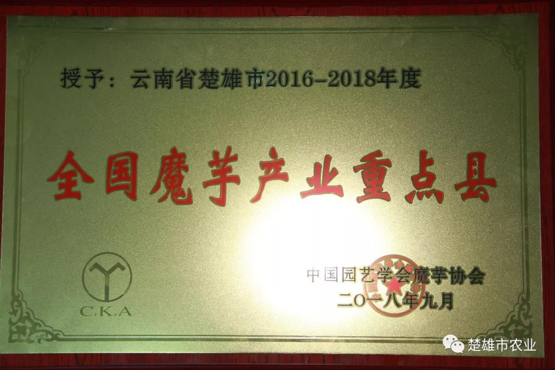 2018年9月17日,在昆明召开的全国魔芋产业发展研讨会上,楚雄市获得“2016—2018年度全国魔芋产业重点县”称号。此次全国仅有10个县(市、区)获此殊荣,分别是云南省富源县、云南省楚雄市、陕西省岚皋县、陕西省安康市汉滨区、陕西省紫阳县、陕西省勉县、湖北省长阳县、湖北省房县、贵州省威宁县和四川省沐川县。