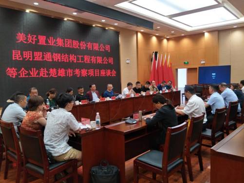 9月8日, 美好置业集团有限公司、昆明盟通钢结构工程有限公司等企业一行16人到楚雄市考察洽谈招商引资项目,双方在市委党校会议室召开考察项目座谈会。