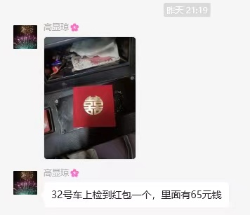 公交车是城市文明的窗口,车厢里不断上演的暖心故事,书写着这个城市的文明篇章。近日,楚雄市公共汽车有限公司7路公车交驾驶员高显琼在车辆到站后,对车厢内进行例行安全检查时,在后排座位上发现一个红包。她马上将其交到公交车调度室,并和调度室的工作人员一起查看了包内物品,发现里面有65元现金。工作人员立即对失物进行了登记,并通过调取相关时间内的监控视频寻找失主。