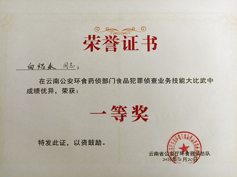 培训期间同步举办全省公安机关环食药侦部门食品犯罪侦查业务技能大比武,楚雄市公安局环食药侦大队教导员白绍永代表楚雄州代表队参加比武,结合楚雄州环食药侦支队办理相关案件情况,对案件集群作战攻坚进行综合分析,详细交流了案件侦办中技战法运用,以93.194分 拔得大比武头筹,在全省16名参赛选手中脱颖而出,荣获一等奖。