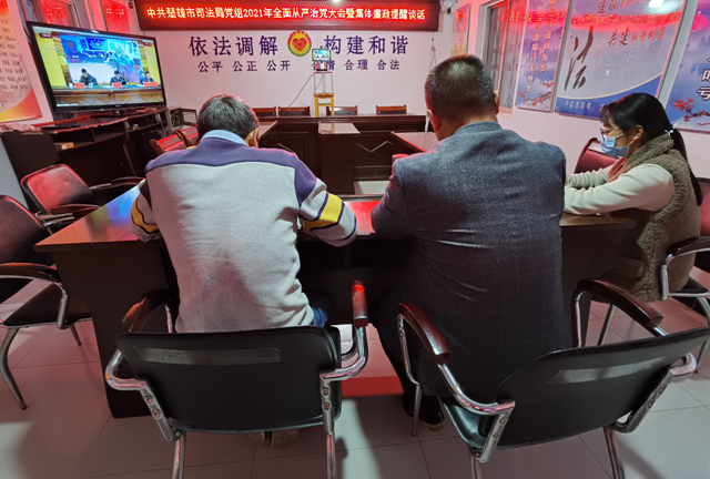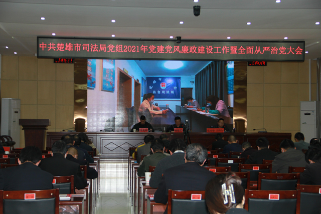 2021年3月12日,中共楚雄市司法局党组召开2021年党建党风廉政建设暨全面从严治党大会,局党组书记、局长陈德君做动员讲话,会议由局党组成员、副局长张兴华主持,局机关全体干部职工、市司法党总支全体党员(含离退休党员、律师党员)、市管律师事务所负责人、市纪委市监委驻市司法局纪检监察组组长李先明参加会议并提工作要求,各乡镇司法所设立分会场。