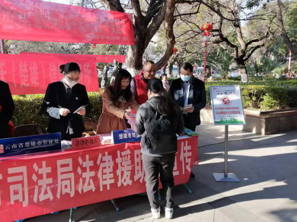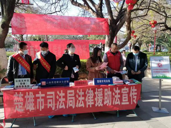 2022年3月2日,楚雄市司法局公共法律服务管理部门组织律师、公证员、法律援助工作人员在楚雄市桃源湖广场通过悬挂横幅、发放宣传资料、现场法律咨询等方式,开展《法律援助法》宣传活动。