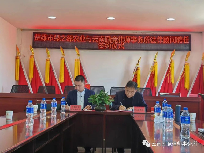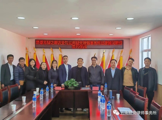 2023年2月11日上午,云南励竞律师事务所与楚雄市绿之源农业发展有限公司举行了常年法律顾问签约仪式,楚雄市司法局新村司法所长李金辉、云南励竞律师事务所律师团队、楚雄市绿之源农业发展有限公司法定代表人董世贵、总经理徐有忠等人出席签约仪式。