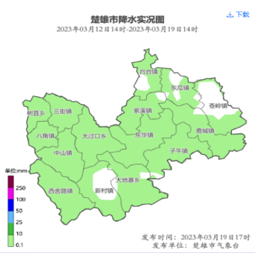2023年3月12日14时~19日14时全市15个乡镇平均降水2.2毫米,最大降水量子午7.4毫米,其次大过口4.8毫米,中山4.2毫米;吕合、紫溪、苍岭、新村无有效降水。