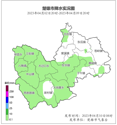 2023年4月2日20时至4月9日20时,全市平均降水0.4毫米,无雨6站,10毫米以下9站,最大雨量大过口和大地基1.4毫米。