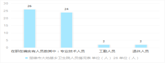 楚雄市大地基乡卫生院部门2019年末实有人员编制26人。其中:行政编制0人(含行政工勤编制0人),事业编制26人(含参公管理事业编制0人);在职在编实有行政人员0人(含行政工勤人员0人),事业人员26人(含参公管理事业人员0人),其他人员0人,主要是专业技术人员24人,工勤人员2人。